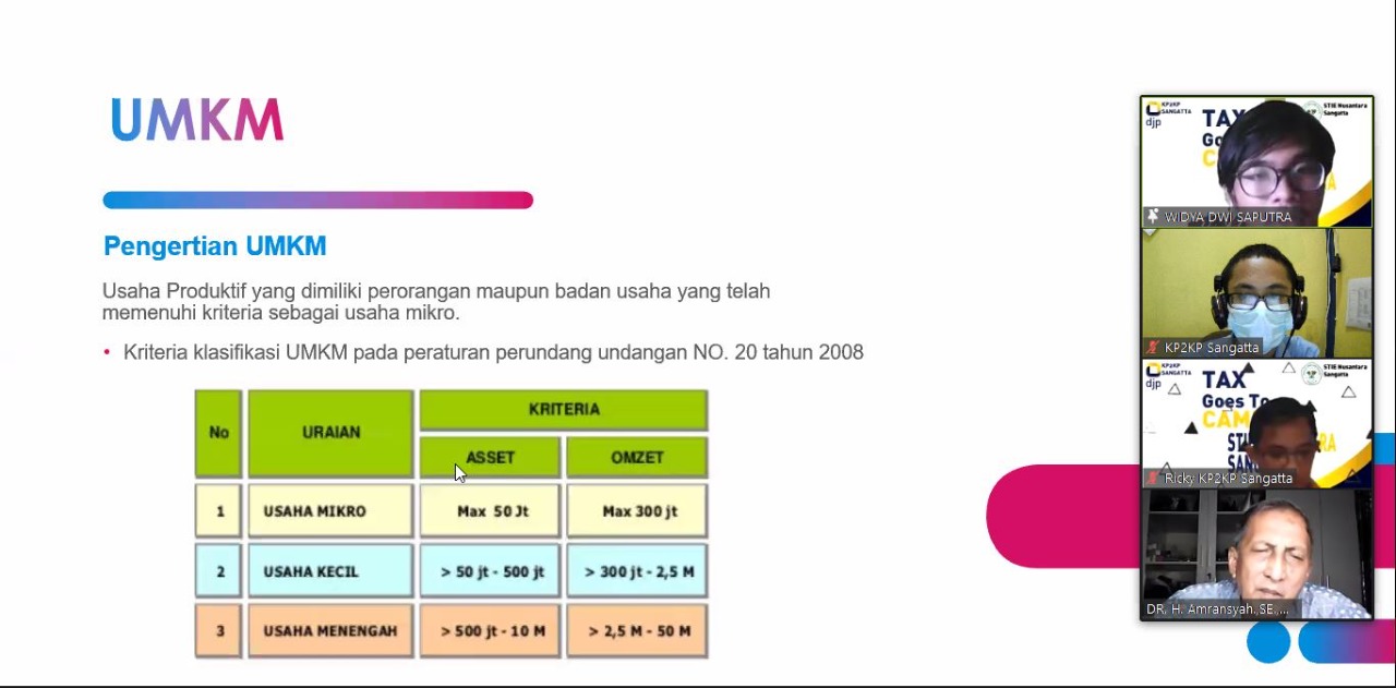 Sebanyak 100 Mahasiswa Sekolah Tinggi Ilmu Ekonomi (STIE) Nusantara Sangatta mengikuti acara Tax Goes To Campus (TGTC) yang diselenggarakan oleh Kantor Pelayanan Penyuluhan dan Konsultai Perpajakan (KP2KP) Sangatta secara daring (Rabu, 31/6).