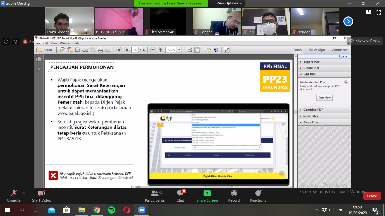 KPP Pratama Karawang Selatan melaksanakan kelas pajak secara daring mengenai Sosialisasi Insentif Pajak Jilid II yakni PMK-44/PMK.03/2020 melalui media telekonferensi Zoom Meeting (Selasa, 19/5).