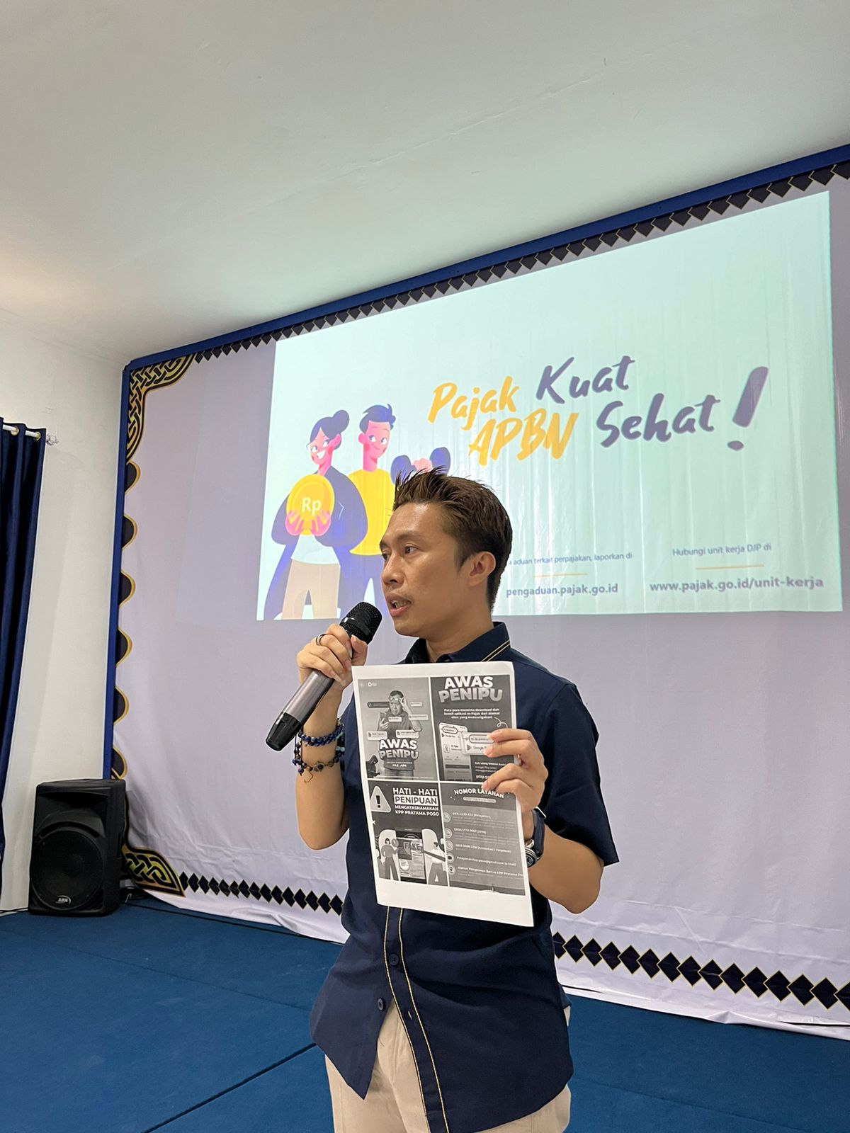 “Bapak/Ibu harap waspada dengan file yang dikirim dan diminta unduh oleh nomor tidak dikenal. Di sini, kami cantumkan nomor layanan KPP Pratama Poso,” tutur Penyuluh Pajak Akhmad Tahmid Amir (Ata) sembari menjelaskan poster waspada penipuan.