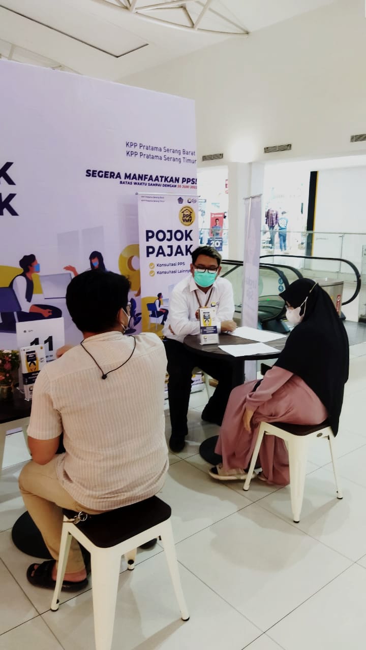 Kantor Pelayanan Pajak (KPP) Pratama Serang Barat memberikan informasi terkait Program Pengungkapan Sukarela (PPS) dengan membuka pojok pajak di Mall of Serang (MoS) Kota Serang (Senin, 20/6). Kegiatan ini dilakukan untuk menyukseskan Program Pengungkapan Sukarela (PPS).