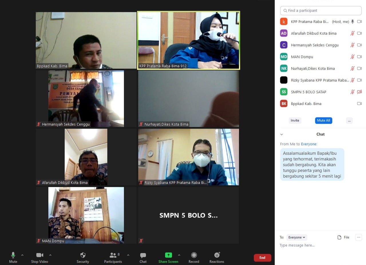 Kegiatan sosialisasi tersebut dilaksanakan melalui aplikasi Zoom Meeting dan dihadiri oleh bendahara pengeluaran di Kota Bima, Kabupaten Bima dan Kabupaten Dompu dengan tetap memperhatikan protokol kesehatan Covid-19.