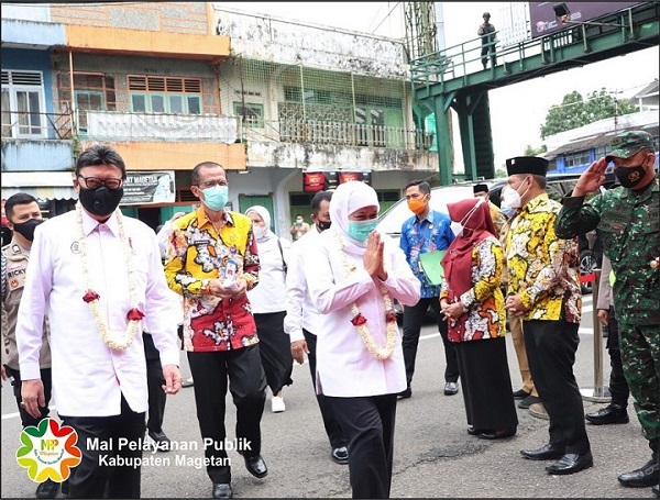 Menteri Pendayagunaan Aparatur Negara dan Reformasi Birokrasi (Menpan RB) Tjahjo Kumolo bersama dengan Gubernur Jawa Timur Khofifah Indar Parawansa dan Bupati Magetan Suprawoto meresmikan Mal Pelayanan Publik (MPP) Kabupaten Magetan (Senin, 5/4). Rombongan Menpan RB dan Gubernur Jawa Timur disambut dengan baik oleh Pemerintah Daerah Kabupaten Magetan.