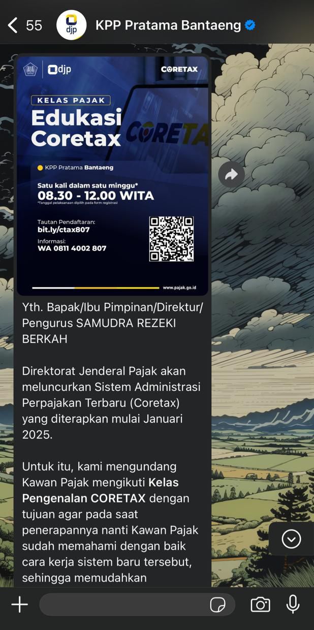 Kantor Pelayanan Pajak (KPP) Pratama Bantaeng mengirimkan pemberitahuan pelaksanaan Kelas Pajak Coretax melalui WhatsApp Blast kepada wajib pajak di Kab. Bantaeng (Selasa, 29/10). Pemberitahuan ini ditunjukan kepada Wajib Pajak Badan yang terdaftar di KPP Pratama Bantaeng.