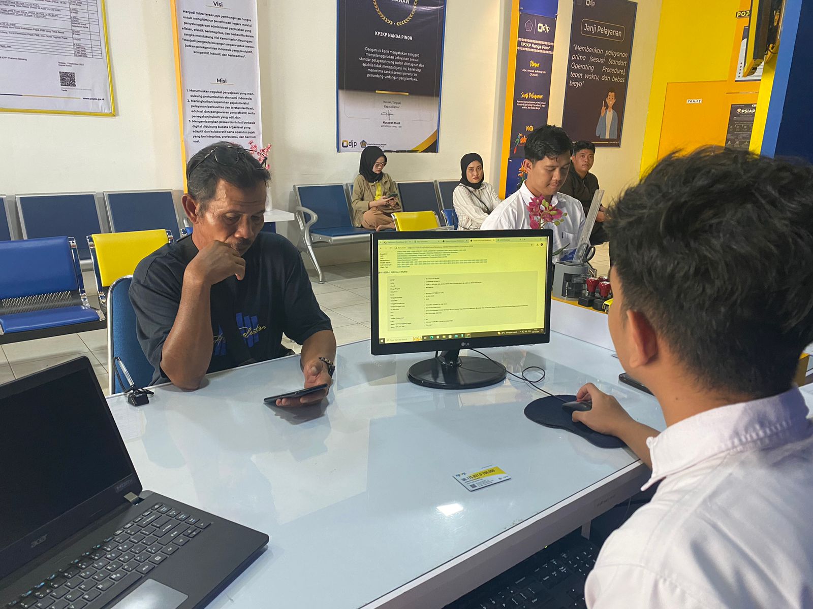 Wajib Pajak melakukan konsultasi terkait pelaporan Surat Pemberitahuan (SPT) Tahunan Orang Pribadi bersama dengan Faisal Jihad Raharja, Petugas Penyuluh Kantor Pelayanan, Penyuluhan, dan Konsultasi Perpajakan (KP2KP) Nanga Pinoh di ruang tempat pelayanan terpadu KP2KP Nanga Pinoh, Kabupaten Melawi (Senin, 28/10).