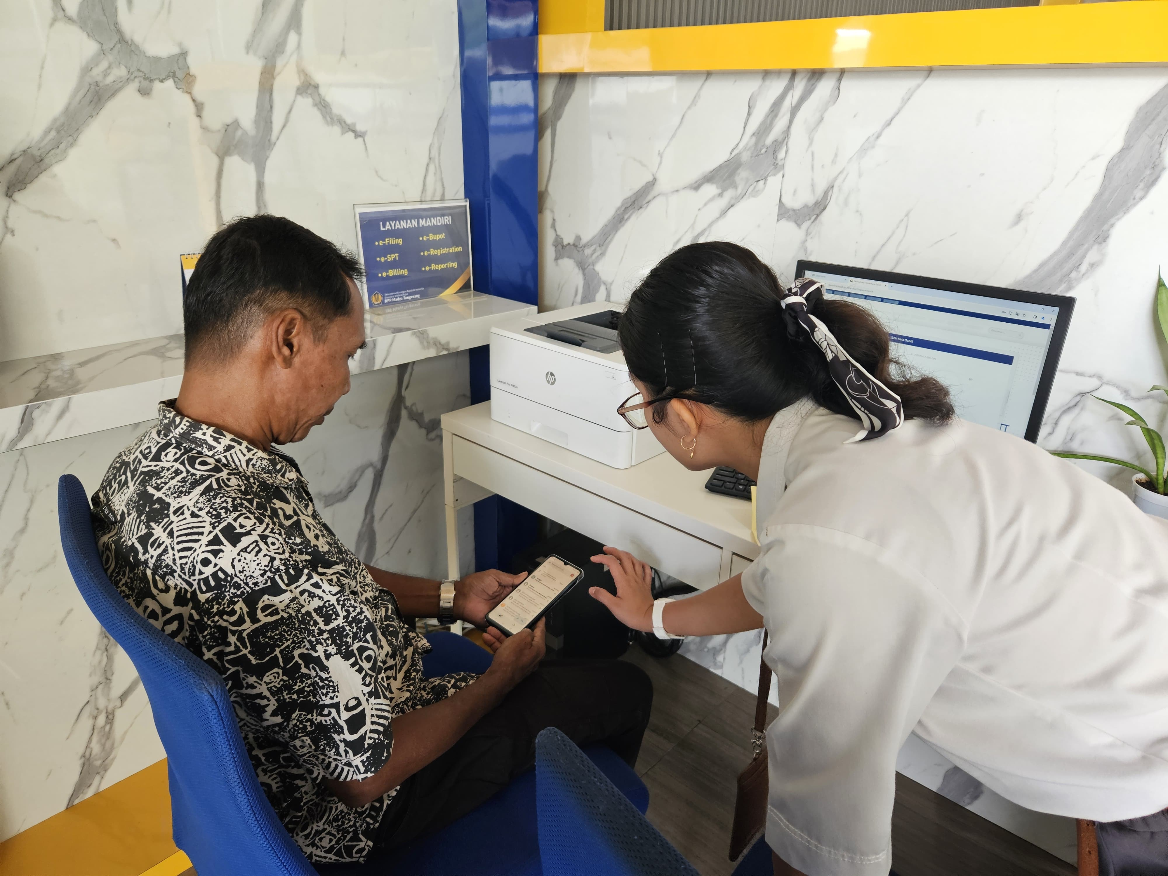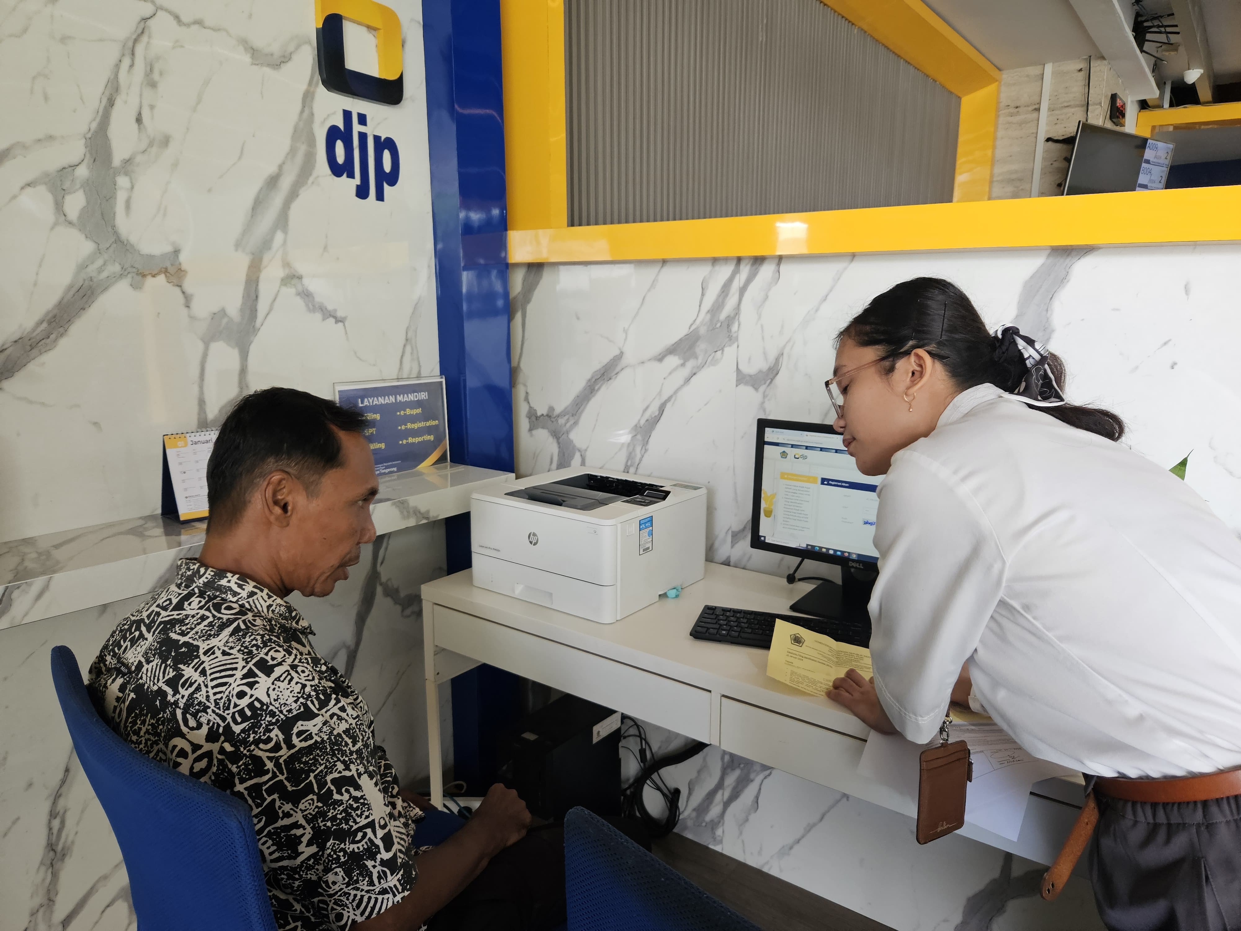 Kantor Pelayanan Pajak (KPP) Madya Tangerang memberikan asistensi pelaporan Surat Pemberitahuan (SPT) Tahunan Orang Pribadi kepada seorang karyawan Dinas Kesehatan Kota Tangerang Selatan di Pojok Layanan Mandiri KPP Madya Tangerang, Jalan Jalur Sutera Barat No.3, Panunggangan Timur, Pinang, Tangerang, Banten (Kamis,18/01).