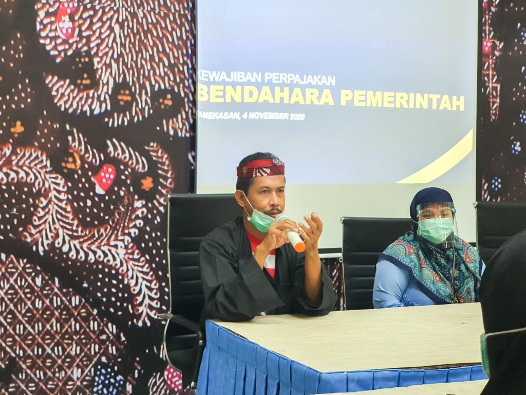 Para pemateri dari KPP Pratama Pamekasan memaparkan kewajiban perpajakan bagi bendahara pemerintah sebagai pemotong dan/atau pemungut pajak dengan menggunakan NPWP Instansi Pemerintah yang baru.