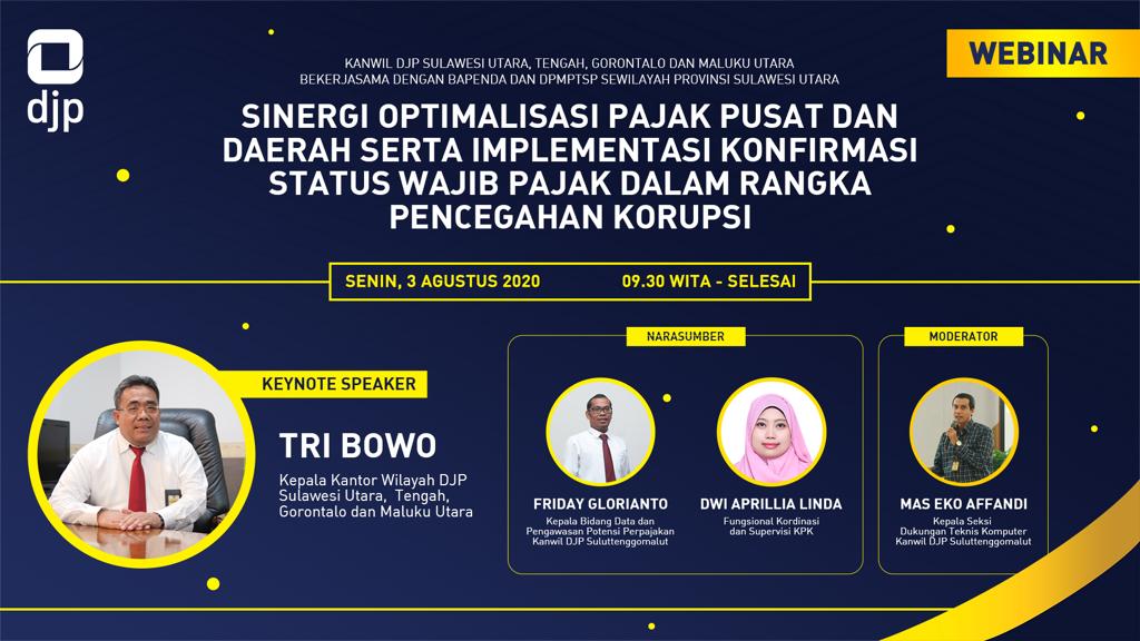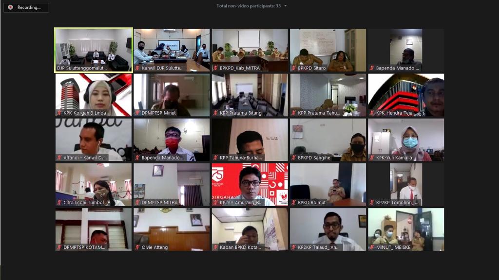Kanwil DJP Suluttenggomalut bersama dengan Komisi Pemberantasan Korupsi Republik Indonesia, Para Kepala Badan Pendapatan Daerah, serta Kepala Dinas Penanaman Modal dan Pelayanan Terpadu Satu Pintu (DPMPTSP) se-wilayah Provinsi Sulawesi Utara menggelar kegiatan koordinasi bertema Sinergi Optimalisasi Pajak Pusat dan Daerah serta Implementasi Konfirmasi Status Wajib Pajak (KSWP) dalam Rangka Pencegahan dan Pemberantasan Korupsi. Koordinasi ini dilaksanakan secara daring melalui aplikasi konferensi video Zoom Cloud Meeting di Manado (Senin, 3/8).