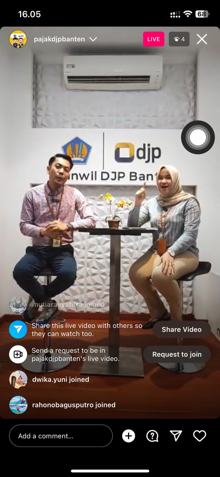 Fungsional Penyuluh Pajak Kantor Wilayah Direktorat Jenderal Pajak (Kanwil DJP) Banten Muslih Anwari menjadi narasumber dan Nadia Firdausi sebagai moderator siaran langsung edukasi perpajakan Ngoppi melalui media sosial Instagram (Live Instagram) membahas tentang pemadanan Nomor Induk Kependudukan (NIK) menjadi Nomor Pokok Wajib Pajak (NPWP) yang bertempat di Ruang Studio Kanwil DJP Banten, Jalan Jenderal Sudirman No. 34, Sumurpecung, Kota Serang, Banten (Selasa, 23/1).