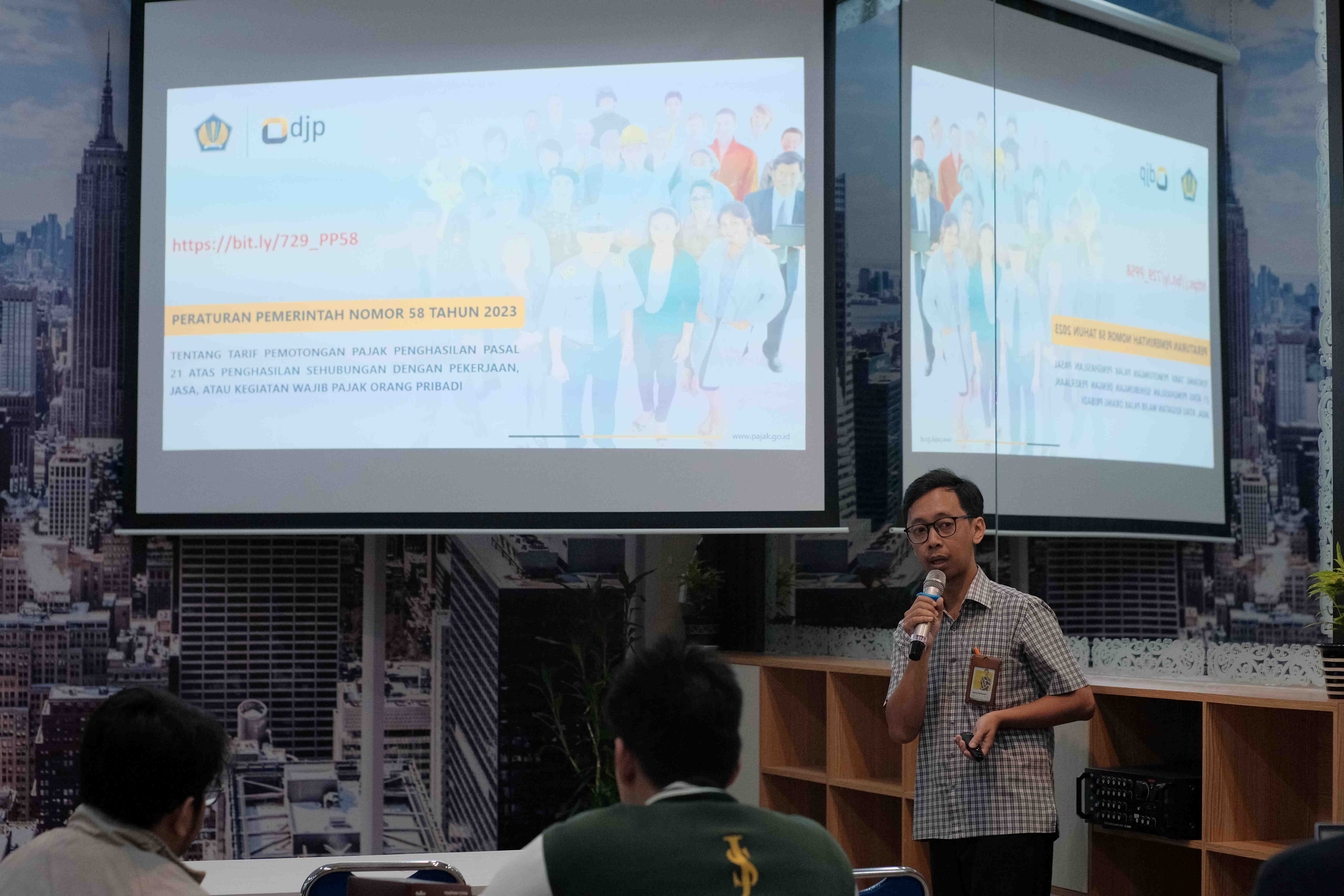 Agung Darmawan, Asisten Penyuluh Pajak dan Ratnawati, Penyuluh Pajak memaparkan materi pemotongan PPh Pasal 21 menggunakan Tarif Efektif Rata-Rata (TER) berdasarkan Peraturan Pemerintah Nomor 58 Tahun 2023 yang berlaku mulai 1 Januari 2024.