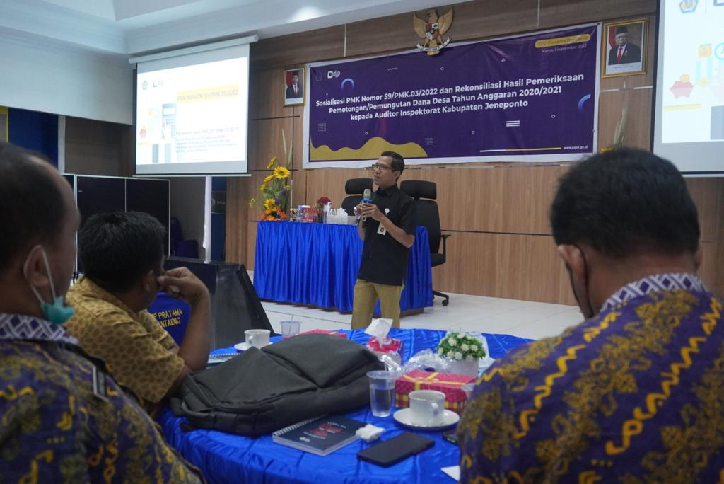 Kegiatan ini dihadiri oleh Friday Glorianto selaku Kepala KPP Pratama Bantaeng dan Mustakim selaku Sekretaris Inspektorat Kabupaten Jeneponto yang mewakili Inspektur Kabupaten Jeneponto. Selain itu, turut hadir juga para Inspektur Pembantu dan Ketua Tim Pemeriksa Dana Desa dari Inspektorat Kabupaten Jeneponto.