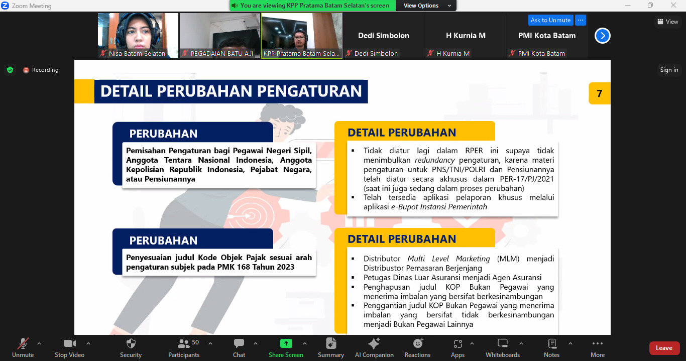 Kantor Pelayanan Pajak (KPP) Pratama Batam Selatan melaksanakan Kelas Pajak Daring membahas Tarif Efektif Rata-Rata (TER) dan Bukti Potong (Bukpot) Pajak Penghasilan (PPh) Pasal 21, serta memberikan informasi singkat terkait dengan Coretax dari Kota Batam, Kepulauan Riau (Rabu, 28/2). Kelas Pajak ini diikuti oleh perwakilan wajib pajak badan usaha.