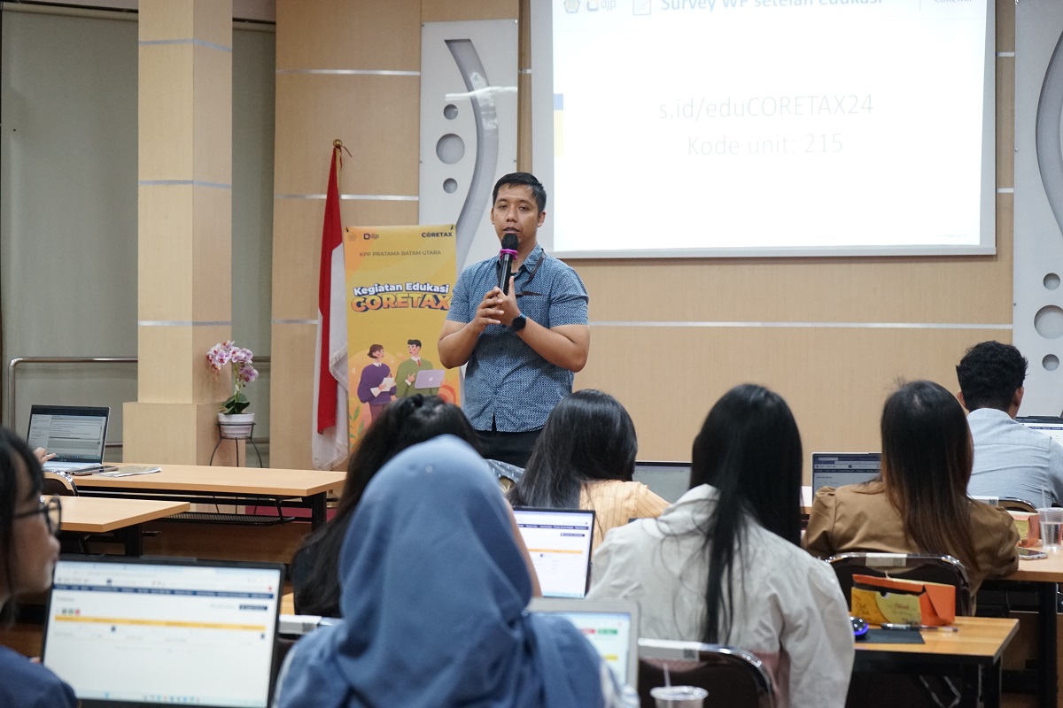Kantor Pelayanan Pajak (KPP) Pratama Batam Utara kembali melaksanakan Edukasi Coretax tahap II yang dilaksanakan di Aula KPP Pratama Batam Utara, Kota Batam (Kamis, 21/11). Kegiatan edukasi yang dilaksanakan setiap hari Kamis ini, mengundang 18 peserta yang merupakan perwakilan Wajib Pajak Badan yang terdaftar di wilayah KPP Pratama Batam Utara.