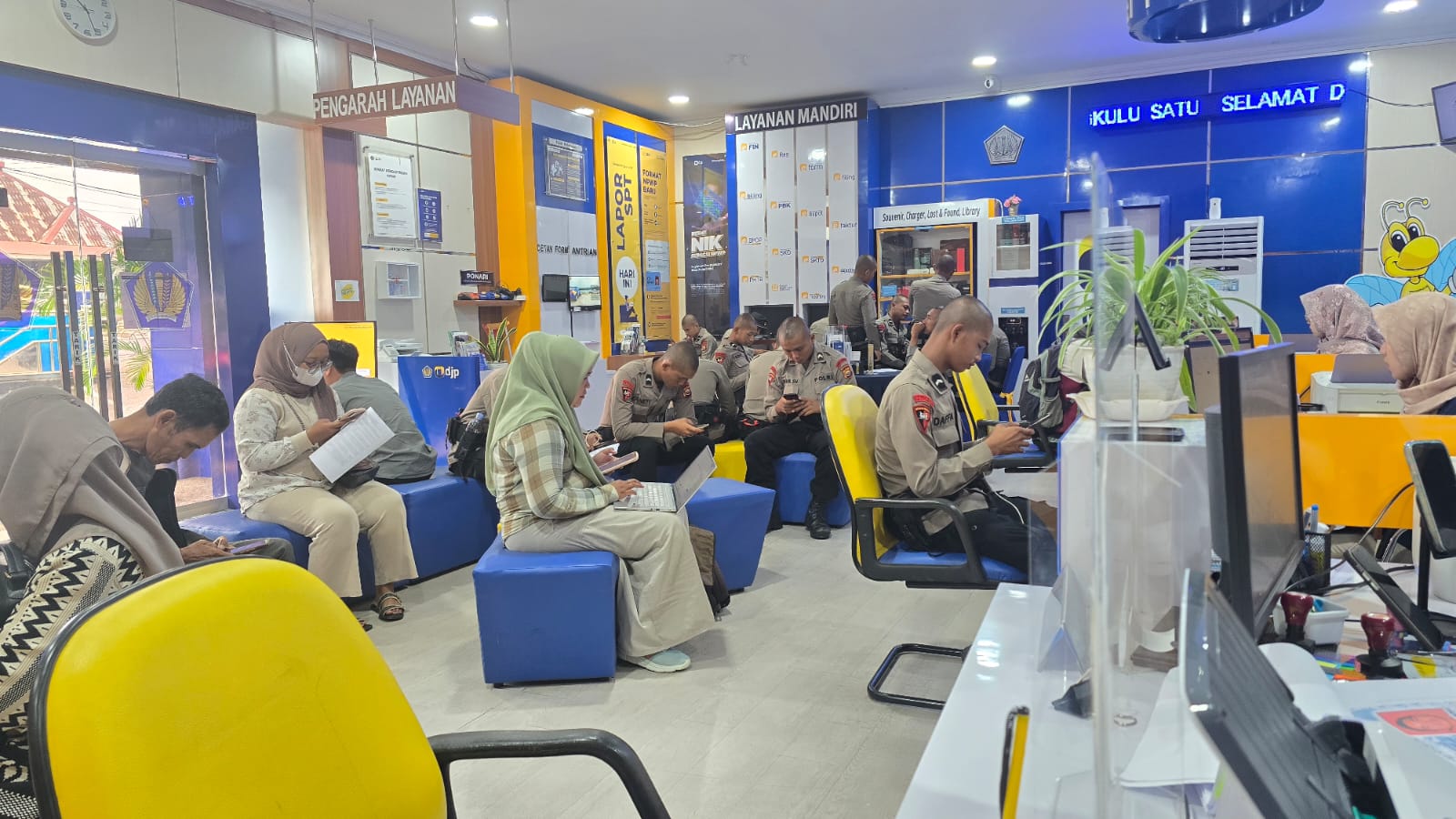 Para anggota Brimob muda memenuhi Kantor Pelayanan Pajak (KPP) Pratama Bengkulu Satu untuk melakukan pendaftaran Nomor Pokok Wajib Pajak (NPWP) di KPP Pratama Bengkulu Satu, Kecamatan Ratu Samban, Kota Bengkulu (Selasa, 14/1).