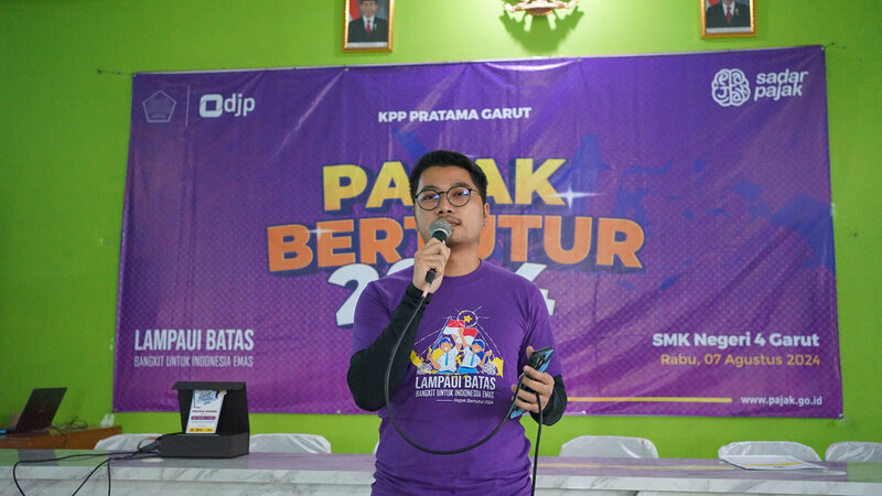 Kantor Pelayanan Pajak (KPP) Pratama Garut melaksanakan kegiatan Pajak Bertutur Tahun 2024 dengan tema “Lampaui Batas, Bangkit untuk Indonesia Emas” di Sekolah Menengah Kejuruan Negeri (SMKN) 4 Garut (Rabu, 7/8).