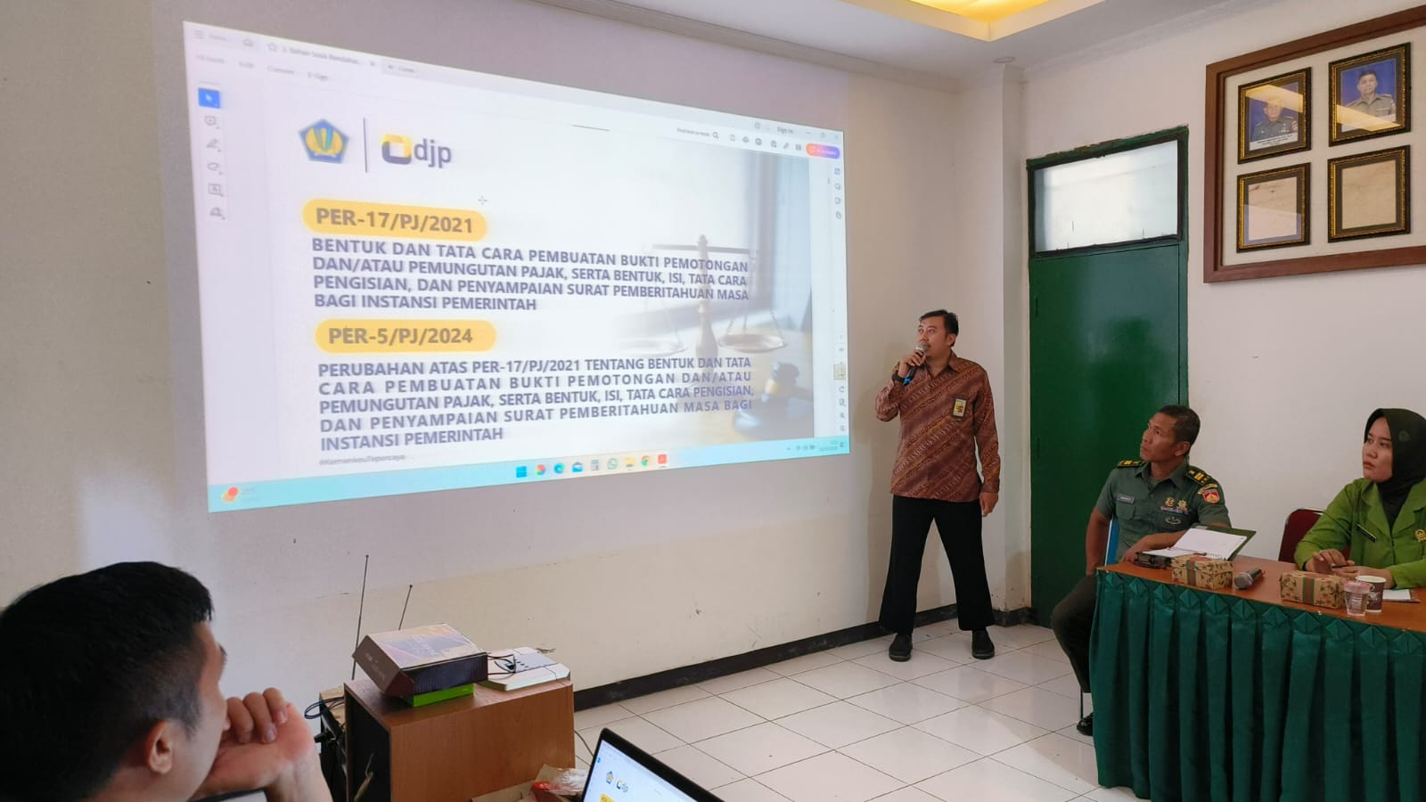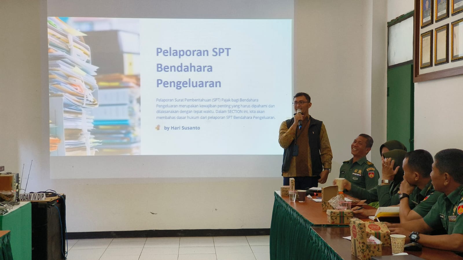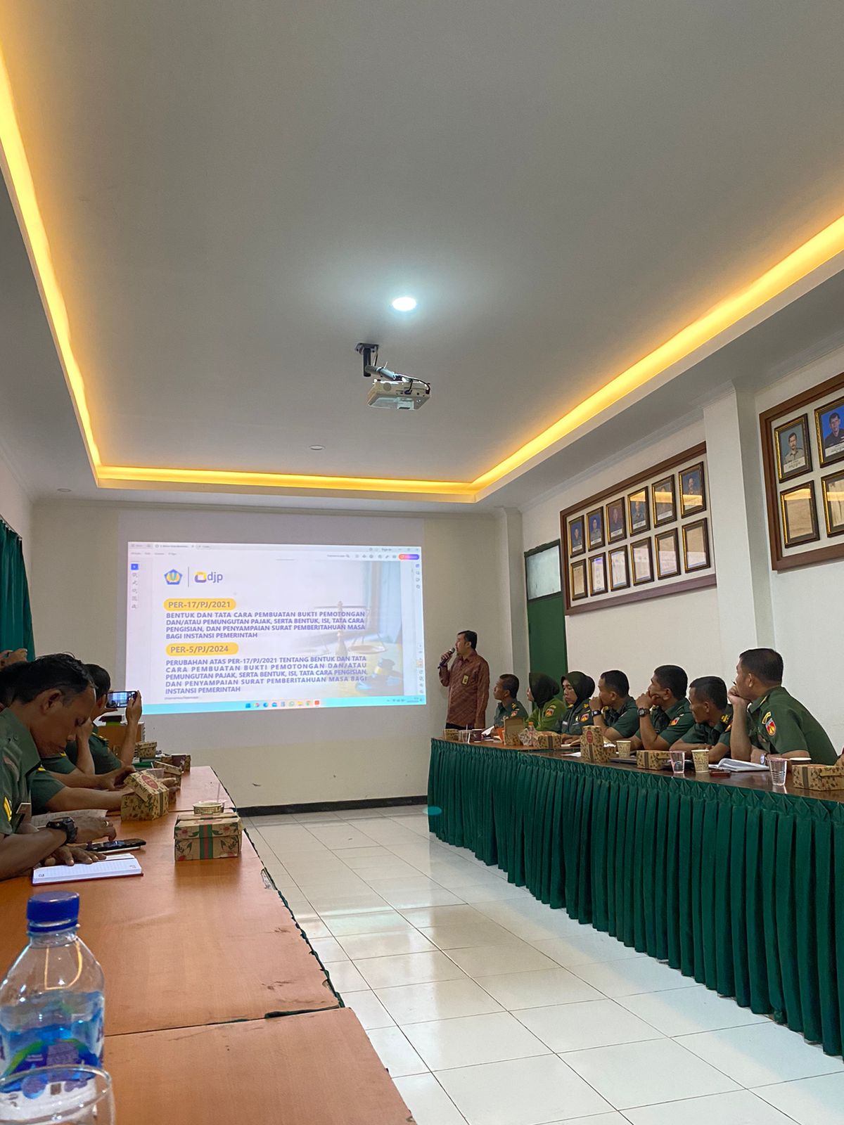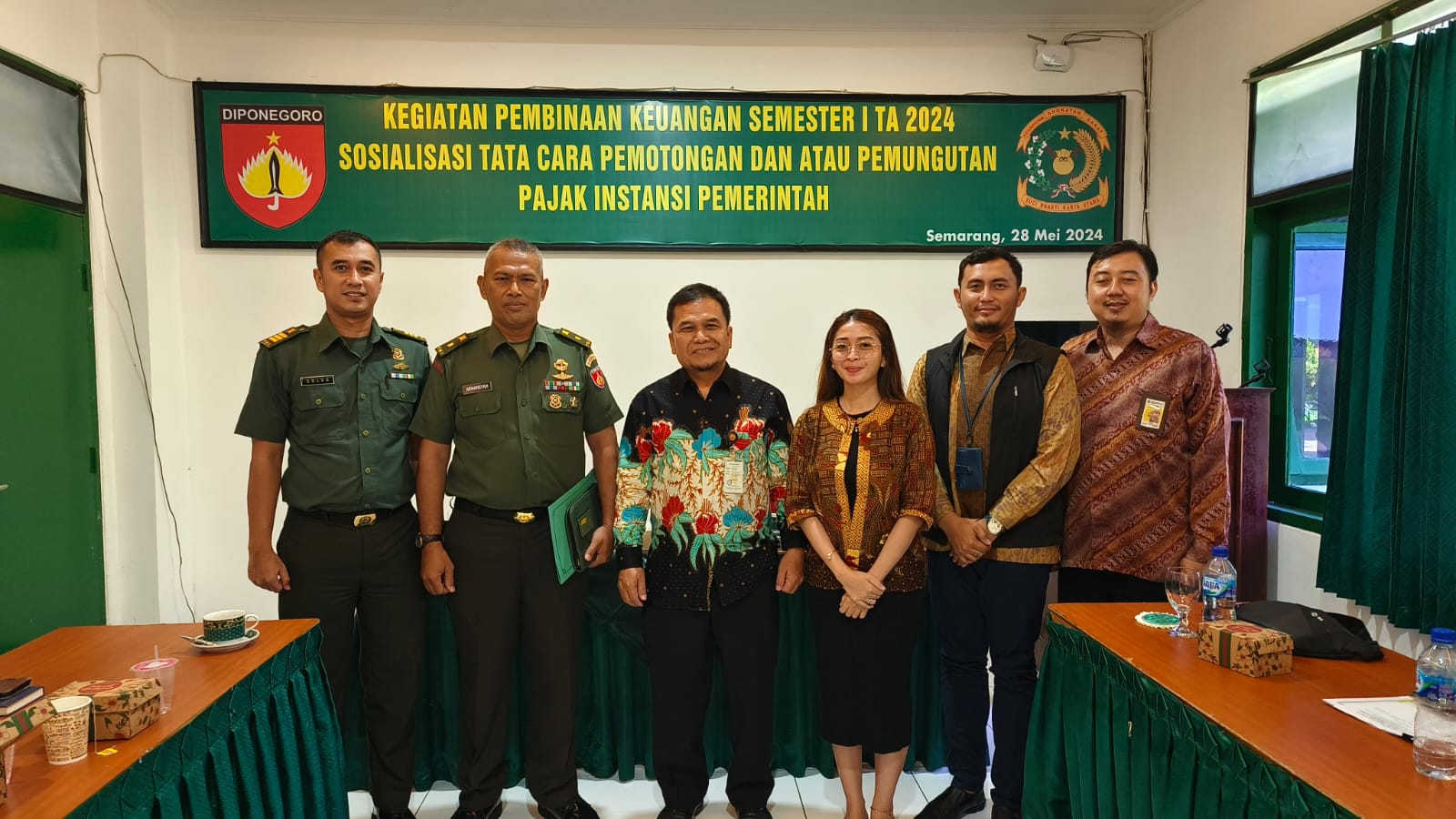 Kantor Pelayanan Pajak (KPP) Pratama Semarang Candisari dan Kodam IV Diponegoro Jawa Tengah dalam acara semester I 2024 Keuangan dengan dihadiri bendahara dari masing-masing satuan kerja (satker) dibawah Kodam IV Diponegoro terkait kewajiban instansi pemerintah dalam menerbitkan bukti pemotongan/pemungutan pada Gedung Aula pukul 08.30 hingga selesai (Selasa, 28/5).