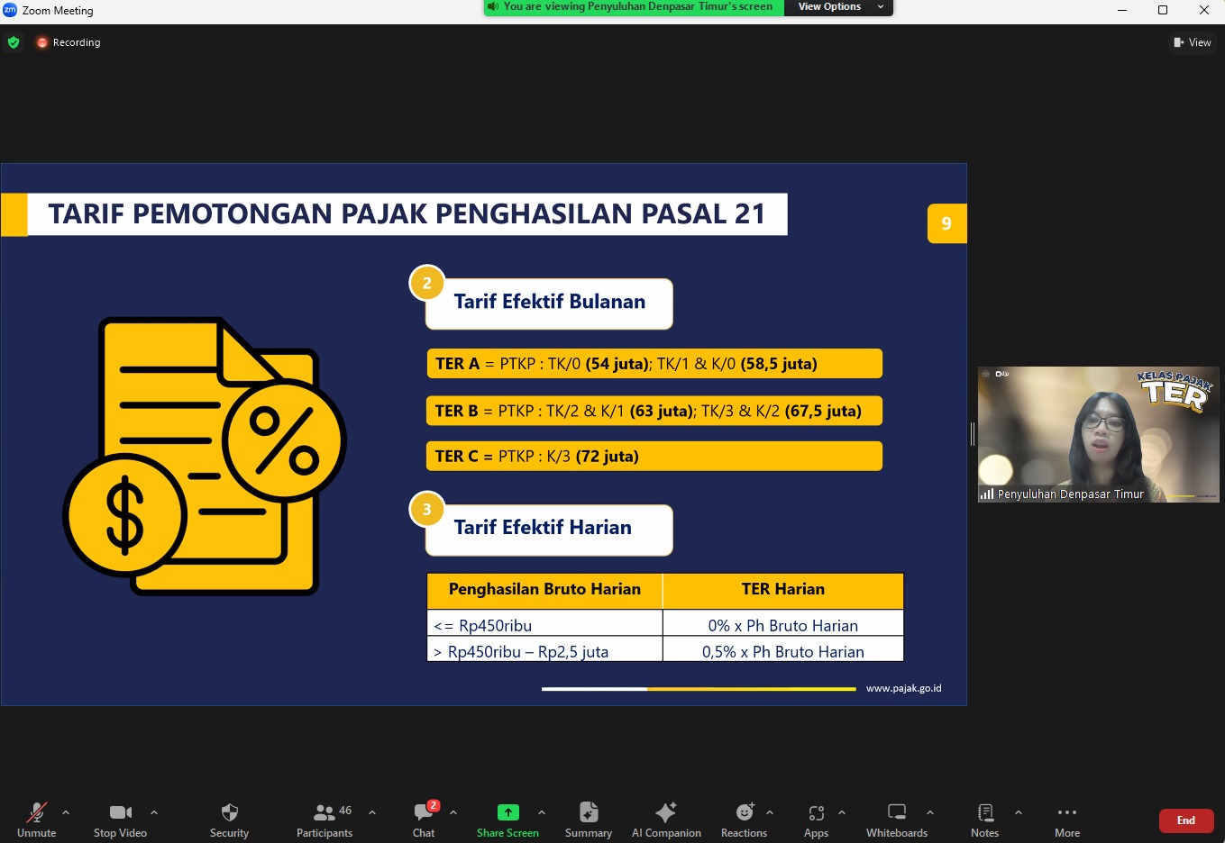 KPP Denpasar Timur pada awal Februari mengadakan Edukasi e-Bupot 21/26 mengundang Wajib Pajak Badan untuk mengedukasi Peraturan PPh Pasal 21 Ter. "Dengan perubahan peraturan ini, tidak ada penambahan beban pajak, tapi secara nyata sangat mempermudah perhitungan", Jelas Nurlita Kumala Sani selaku Penyuluh Pajak pada acara yang digelar secara daring di KPP Denpasar Timur, Denpasar, Bali (Selasa, 6/2).