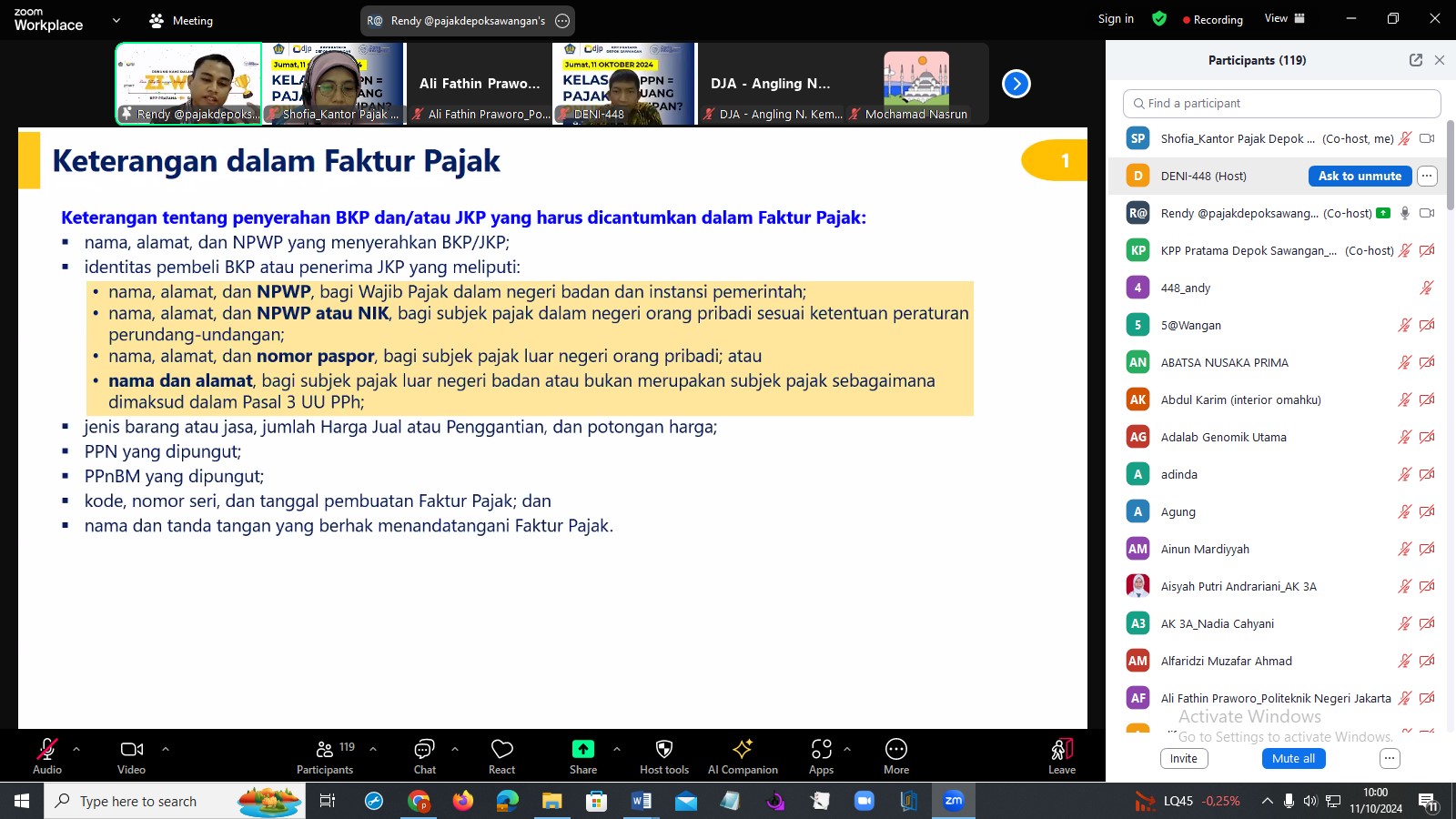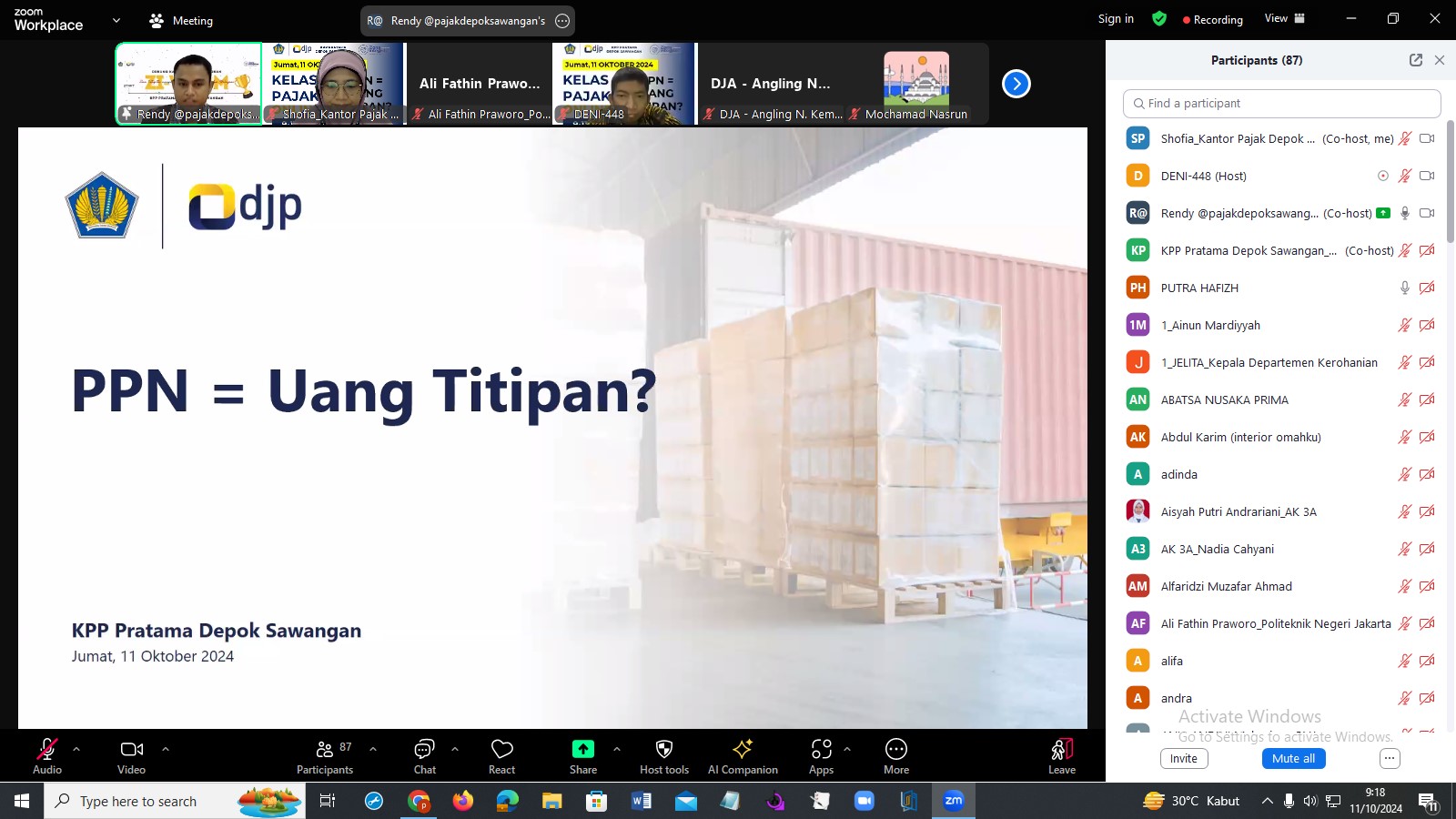 Kantor Pelayanan Pajak (KPP) Pratama Depok Sawangan mengadakan kelas pajak online melalui aplikasi Zoom Meeting kepada Wajib Pajak Badan yang telah terdaftar menjadi Pengusaha Kena Pajak (PKP) di wilayah kerja KPP Pratama Depok Sawangan pada tahun 2024 di Kota Depok (Jumat, 11/10). Kelas Pajak kali ini dihadiri oleh 120 Wajib Pajak Badan Pengusaha Kena Pajak. Kelas pajak ini bertujuan mengedukasi wajib pajak yang baru terdaftar sebagai PKP pada tahun 2024.