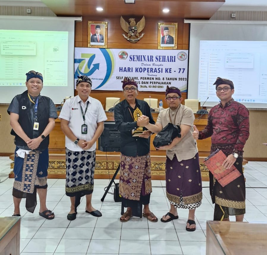 I Kadek Semaradana, S.E., Ketua Panitia Peringatan Hari Koperasi ke-77 Kabupaten Klungkung mengucapkan terima kasih kepada Kantor Pelayanan Pajak (KPP) Pratama Gianyar, terkhusus kepada narasumber yang ditugaskan pada acara Seminar Sehari yang telah terlaksana di Praja Mandala Kantor Bupati Klungkung, Kabupaten Klungkung, Bali (Kamis, 18/7).