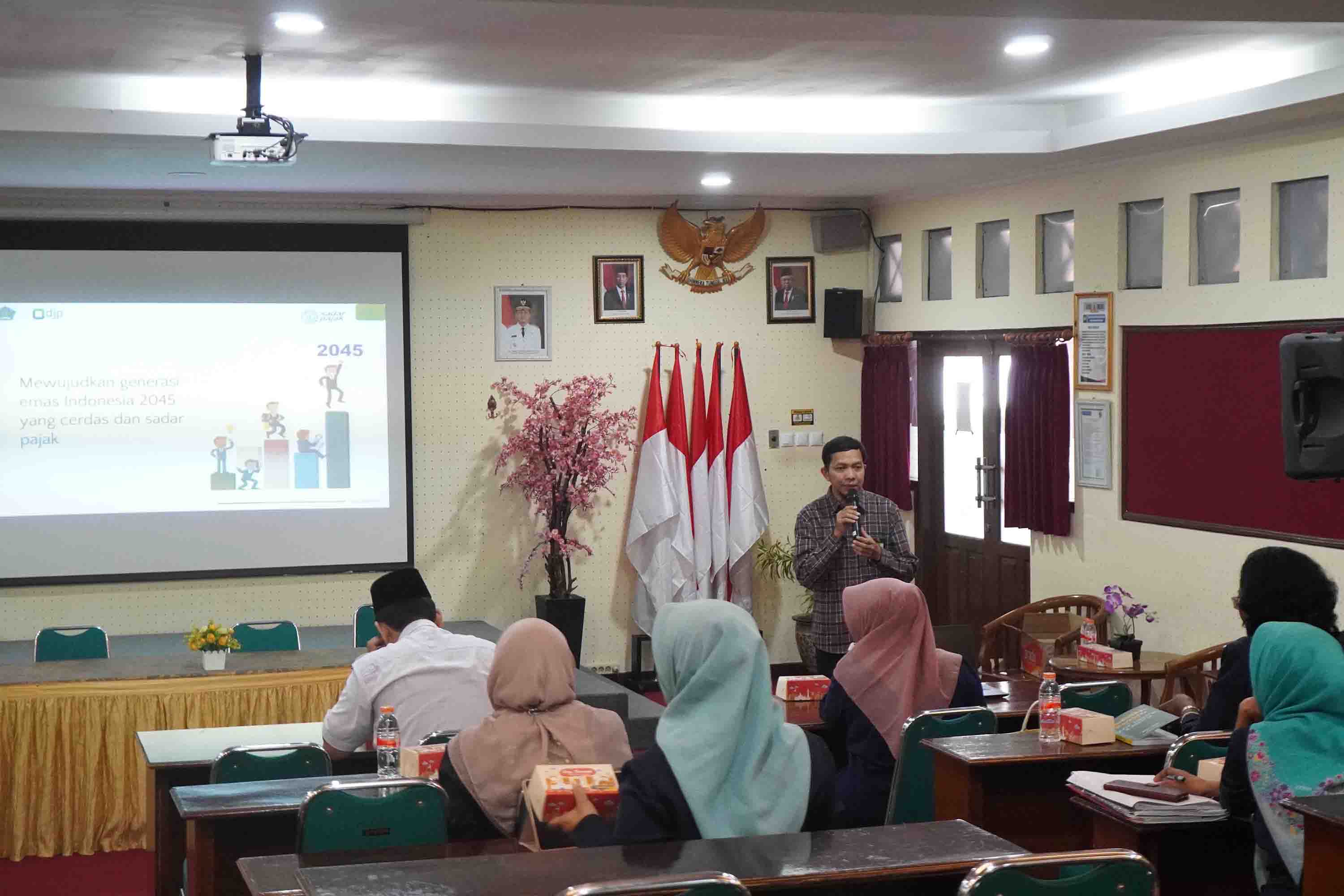 Materi Sharing Session disampikan oleh Ari Widodo, Fungsional Penyuluh Pajak Ahli Muda Kanwil DJP Jakarta Selatan I. “Kami berharap para siswa nantinya setelah menjadi wajib pajak, mampu memenuhi segala kewajiban perpajakannya, serta dapat menumbuhkan rasa cinta tanah air melalui pemenuhan kewajiban perpajakan,” ujar Ari. Selain itu, Ari juga turut menyampaikan tahapan-tahapan implementasi program Inklusi Kesadaran Pajak yang dimulai dengan kegiatan Sharing Session ini, dilanjutkan dengan bimbingan teknis penyusunan dan implementasi Rancangan Pelaksanaan Pembelajaran (RPP), sampai dengan proses monitoring dan evaluasi.