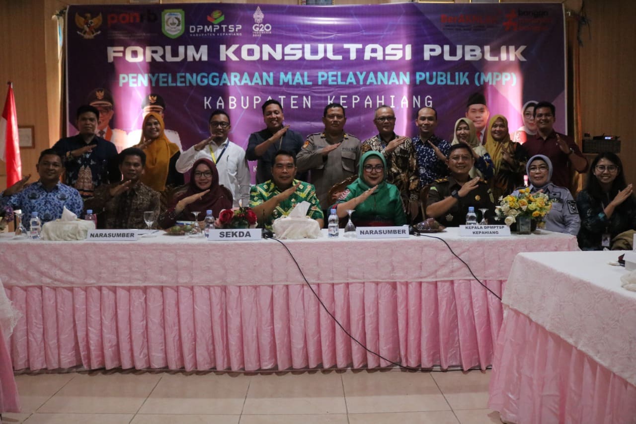 Kegiatan forum konsultasi publik ini dimulai pukul 13.00 s.d 16.00 WIB dan bertempat di Aula Sekretariat Daerah Kabupaten Kepahiang. Bupati Kepahiang diwakili Sekretaris Daerah Kabupaten Kepahiang, Narasumber dari Kementerian Pendayagunaan Aparatur Negara dan Reformasi Birokrasi (KemenpanRB), Kepala Dinas Penanaman Modal dan Pelayanan Terpadu Satu Pintu (DPMPTSP) Kabupaten Kepahiang hadir sebagai narasumber kegiatan forum konsultasi publik penyelenggaraan MPP ini.