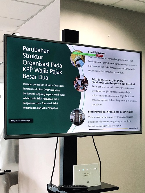 Sebelum menyampaikan materi inti, penyuluh turut menceritakan perubahan struktur organisasi di Direktorat Jenderal Pajak, khususnya di Kanwil WP Besar dan KPP WP Besar Dua.