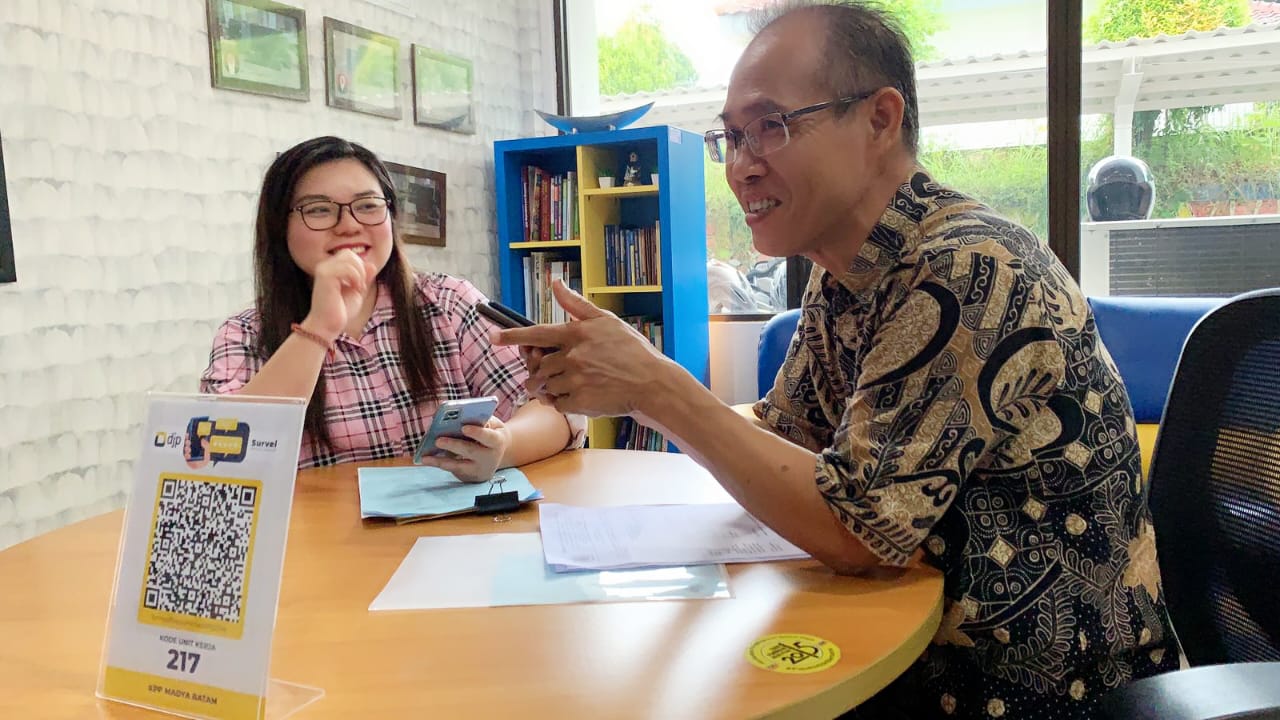 Fungsional penyuluh pajak Kantor Pelayanan Pajak (KPP) Madya Batam, Juliana memberikan edukasi kepada Wajib Pajak terkait salah satu layanan perpajakan yakni pemindahbukuan melalui loket helpdesk KPP Madya Batam (Kamis, 19/9).