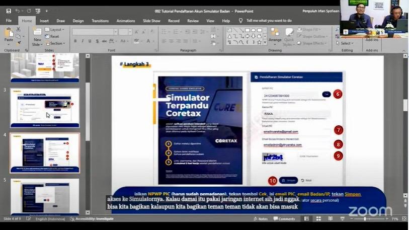 “Di menu informasi, akan muncul gambar Daftar Simulator Coretax. Nanti bisa diklik dan akan muncul Nomor Pokok Wajib Pajak (NPWP) Person In Charge (PIC), kemudian klik tombol cek dan isi email PIC, email badan atau instansi pemerintah. Lalu klik simpan,” tambahnya.