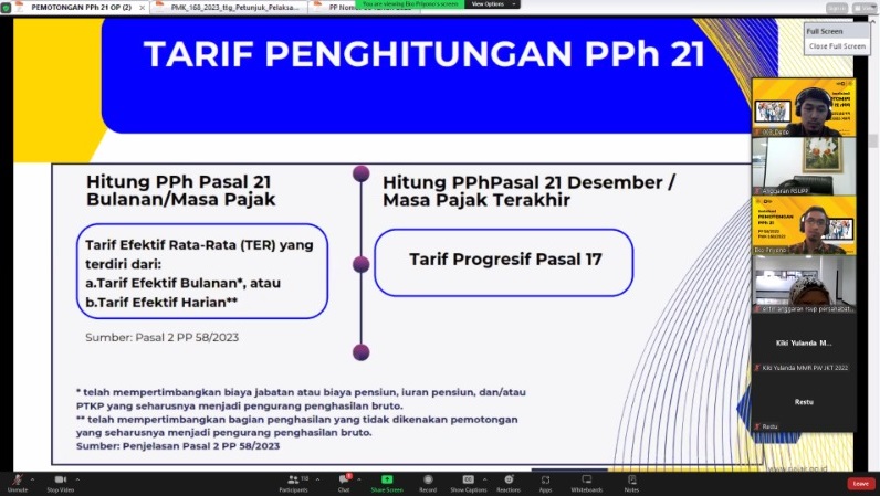 Acara yang diikuti oleh 168 peserta ini menghadirkan dua narasumber Penyuluh KPP Pratama Jakarta Pulogadung, yaitu Eko Priyono dan Dede Saptian. Materi Pemotongan PPh 21 sesuai dengan ketentuan terbaru dalam Peraturan Pemerintah Nomor 58 Tahun 2023 (PP 58/2023) menjadi topik utama yang dibahas. Acara dimulai pada pukul 13.00 WIB hingga 15.00 WIB.
