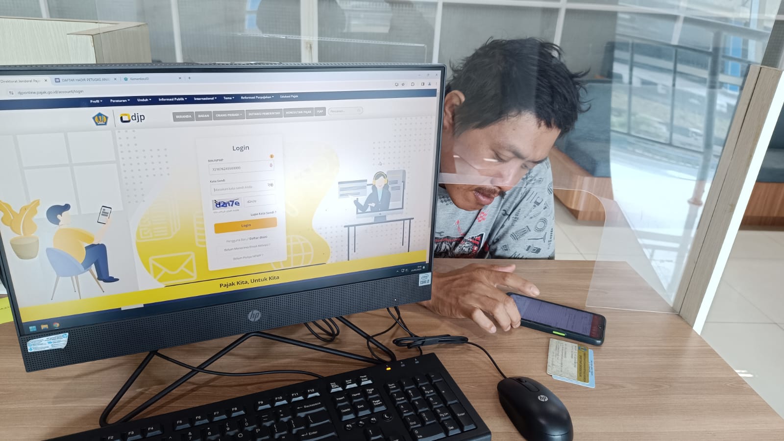 Wahyu Setiawan wajib pajak asal Mangkang Kulon Semarang mengunjungi loket KPP Pratama Semarang untuk melaporkan Surat Pemberitahuan (SPT) Tahunan tahun pajak 2023. Ini adalah pertama kali ia melaporkan SPT Tahunan secara online sehingga harus melakukan registrasi akun DJP Online terlebih dahulu pada laman djponline.pajak.go.id.