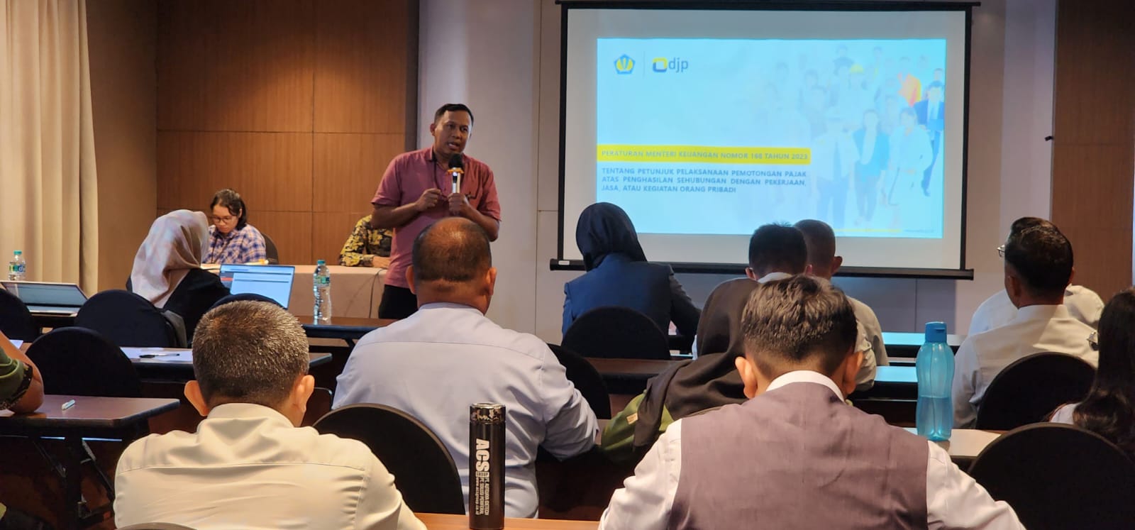 Kantor Pelayanan Pajak (KPP) Pratama Serpong melaksanakan kegiatan sosialisasi terkait Peraturan Menteri Keuangan Nomor 168 Tahun 2023 tentang Petunjuk Pelaksanaan Pemotongan Pajak atas Penghasilan sehubungan dengan Pekerjaan, Jasa, atau Kegiatan Pribadi bertempat di Hotel Soll Marina, Kecamatan Serpong Utara, Kota Tangerang Selatan (Selasa, 6/2). Acara dibuka oleh HRD PT Soll Marina, Lisa dan dilaksanakan di aula lantai M mulai pukul 10.00 s.d. selesai.