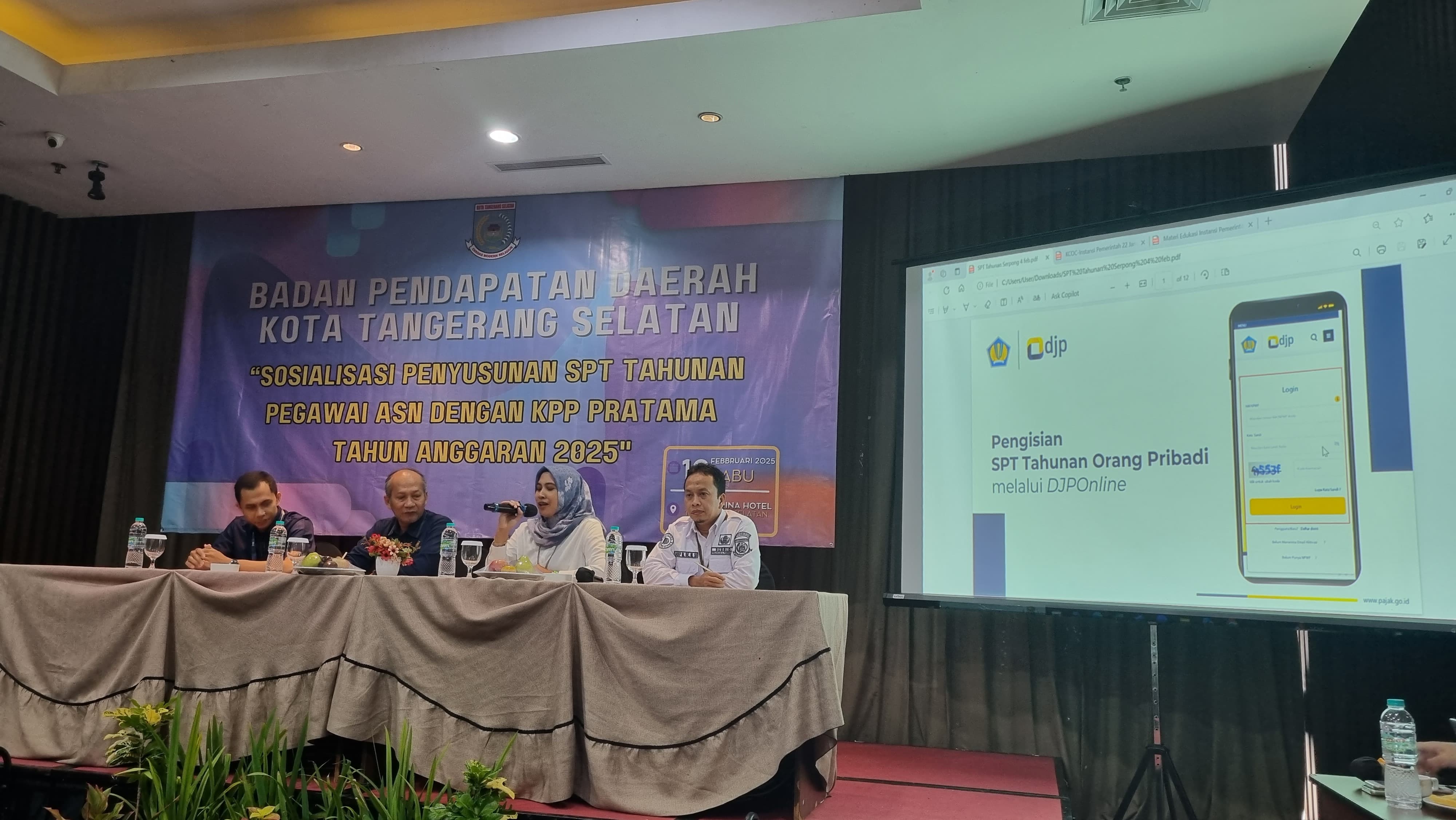 Kantor Pelayanan Pajak (KPP) Pratama Serpong melaksanakan sosialisasi terkait Penyusunan SPT Tahunan bagi Aparatur Sipil Negara (ASN) Badan Pendapatan Daerah Kota Tangerang Selatan bertempat di Hotel Soll Marina, Kota Tangerang Selatan (Rabu, 19/2). Acara dimulai pukul 09.00 WIB sampai selesai dan diikuti oleh sekitar 60 peserta.
