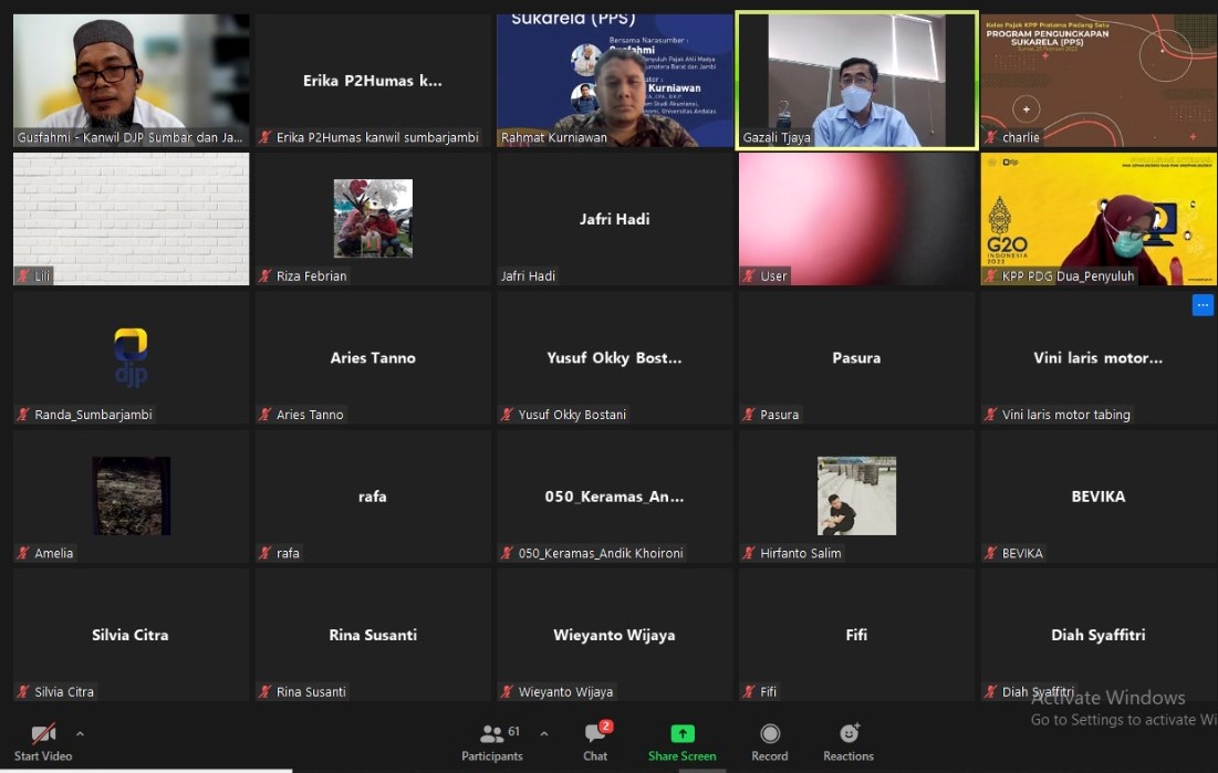 Kantor Wilayah Direktorat Jenderal Pajak (Kanwil DJP) Sumatera Barat dan Jambi melakukan kegiatan Edukasi Perpajakan Program Pengungkapan Sukarela (PPS) bagi Ikatan Konsultan Pajak Indonesia (IKPI) Cabang Padang secara daring melalui Aplikasi Zoom Cloud Meetings di Padang (Senin, 14/03).