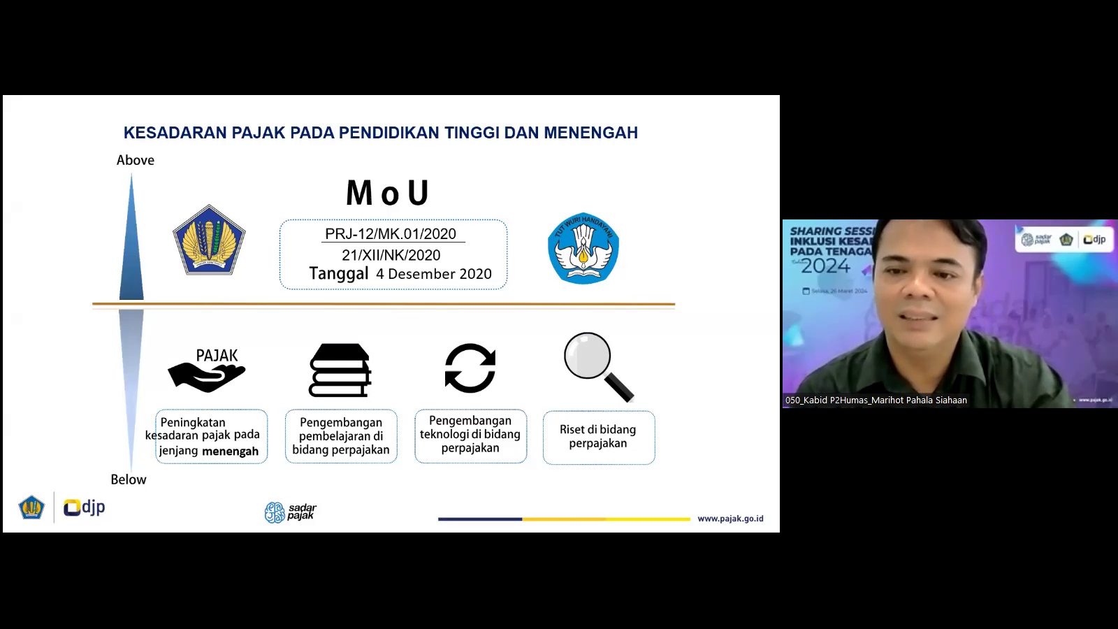 “Terima kasih telah hadir dalam program kerja sama Kementerian Keuangan dan Kementerian Pendidikan, Kebudayaan, Riset, dan Teknologi terkait inklusi kesadaran pajak. Inklusi kesadaran pajak ini memiliki tujuan meningkatkan kesadaran pajak secara dini bagi calon wajib pajak, mahasiswa, dan siswa sekolah mendatang. Banyak program yang telah dilakukan oleh DJP, seperti Tax Goes to School, di mana kita menyampaikan pajak dalam bentuk permainan, Tax Goes to Campus, Pajak Bertutur, dan Kemenkeu Mengajar,” sambutan Bapak Marihot Pahala Siahaan mewakili Kepala Kanwil DJP Sumatera Barat dan Jambi.