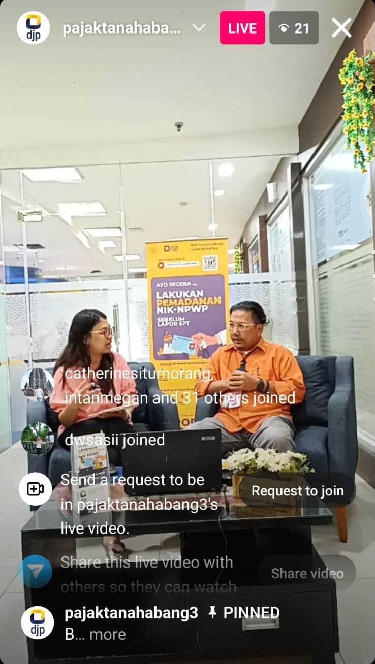 KPP Pratama Jakarta Tanah Abang Tiga memberikan edukasi perpajakan tentang pemadanan NIK-NPWP secara daring (Instagram Live) sekaligus mengajak Kawan Pajak untuk segera melakukan pemadanan NIK-NPWP (Senin, 11/12).