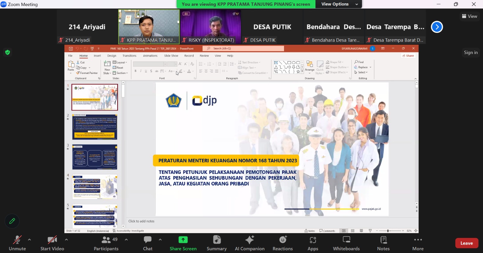 Kantor Pelayanan Pajak (KPP) Pratama Tanjung Pinang menyelenggarakan sosialisasi tentang Peraturan Pemerintah Nomor 58 Tahun 2023 (PP 58/2023) yang mengatur tarif pemotongan Pajak Penghasilan Pasal 21 atas penghasilan sehubungan dengan pekerjaan, jasa, atau kegiatan Wajib Pajak Orang Pribadi kepada 38 bendahara instansi pemerintah, kecamatan dan desa sekabupaten Kepulauan Anambas (Kamis, 7/3). Kegiatan sosialisasi berlangsung secara daring melalui aplikasi Zoom Meetings dari Kota Tanjungpinang.