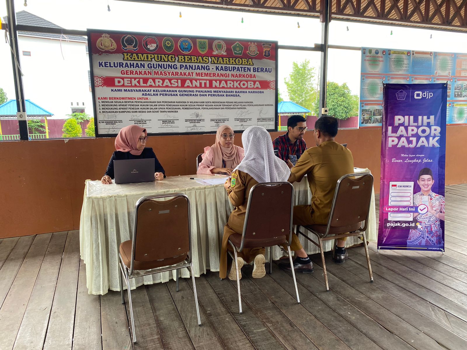 Dalam upaya meningkatkan tingkat kepatuhan pelaporan Surat Pemberitahuan (SPT) Tahunan, Account Representative (AR) Seksi Pengawasan II Kantor Pelayanan Pajak (KPP) Pratama Tanjung Redeb Ghani Zulfikar Widodo, Rano Putra, Alminatu Suraya, dan pelaksana Seksi Pelayanan Emmy Karmila menggelar layanan pojok pajak di Kantor Kelurahan Gunung Panjang, Jalan Gunung Panjang, Tanjung Redeb, Kab. Berau, Kalimantan Timur (Selasa, 19/3).