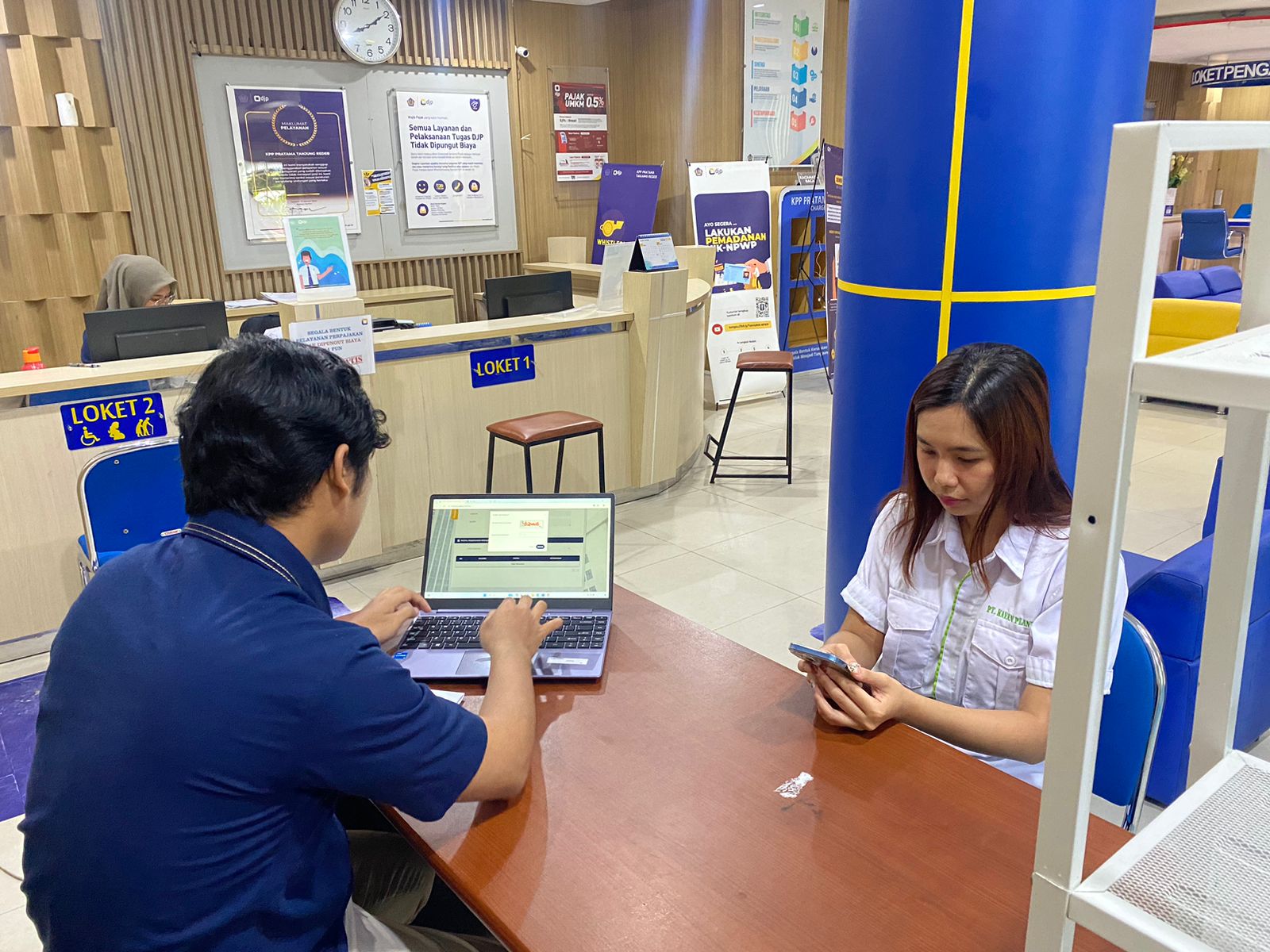 Syahril Azis selaku pegawai Kantor Pelayanan Pajak (KPP) Pratama Tanjung Redeb memberikan layanan konsultasi secara langsung kepada Wajib Pajak Badan di KPP Pratama Tanjung Redeb, Jalan Jenderal Sudirman No 104, Pamusian, Tarakan Tengah, Kota Tarakan, Kalimantan Utara (Rabu, 15/5).