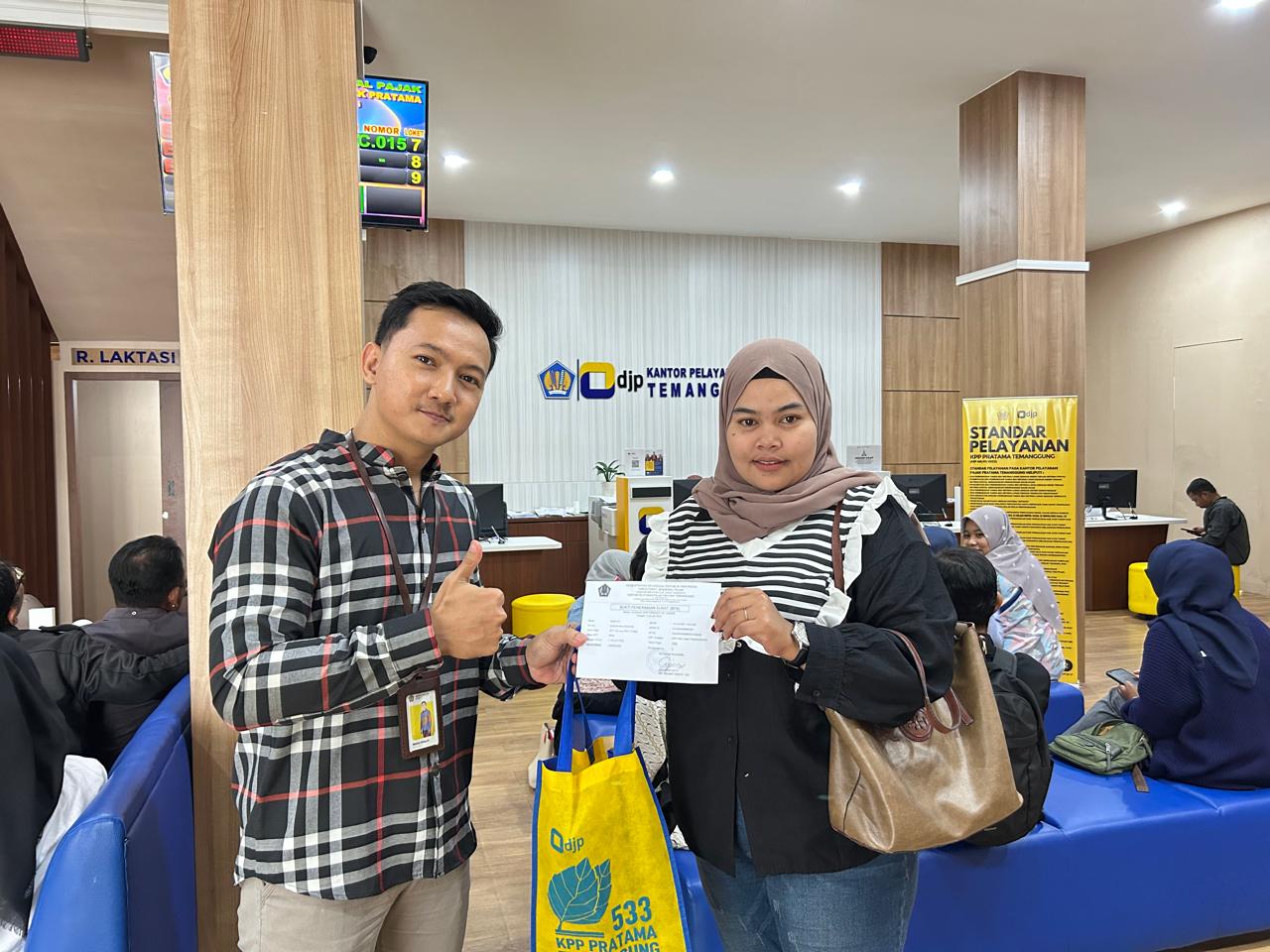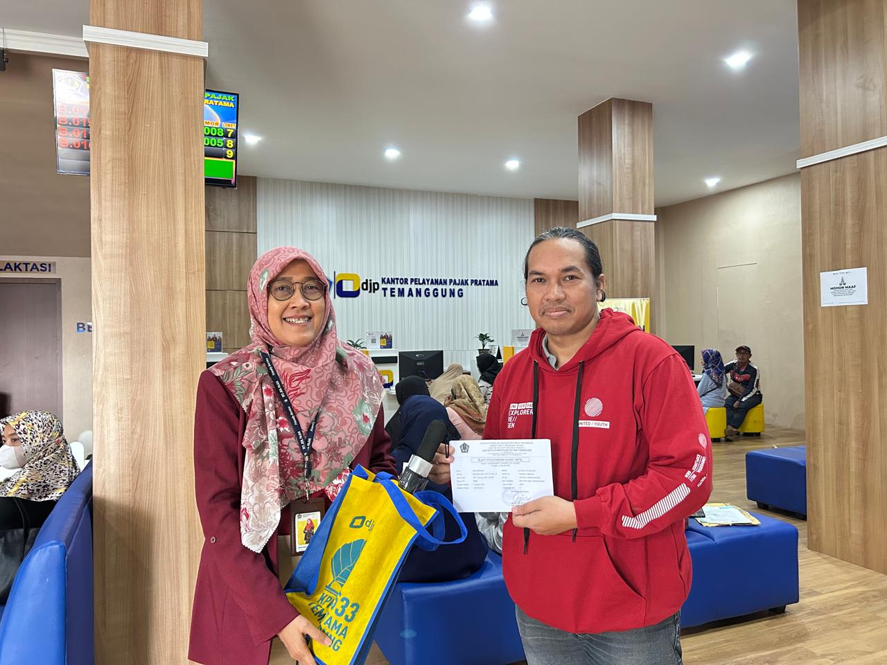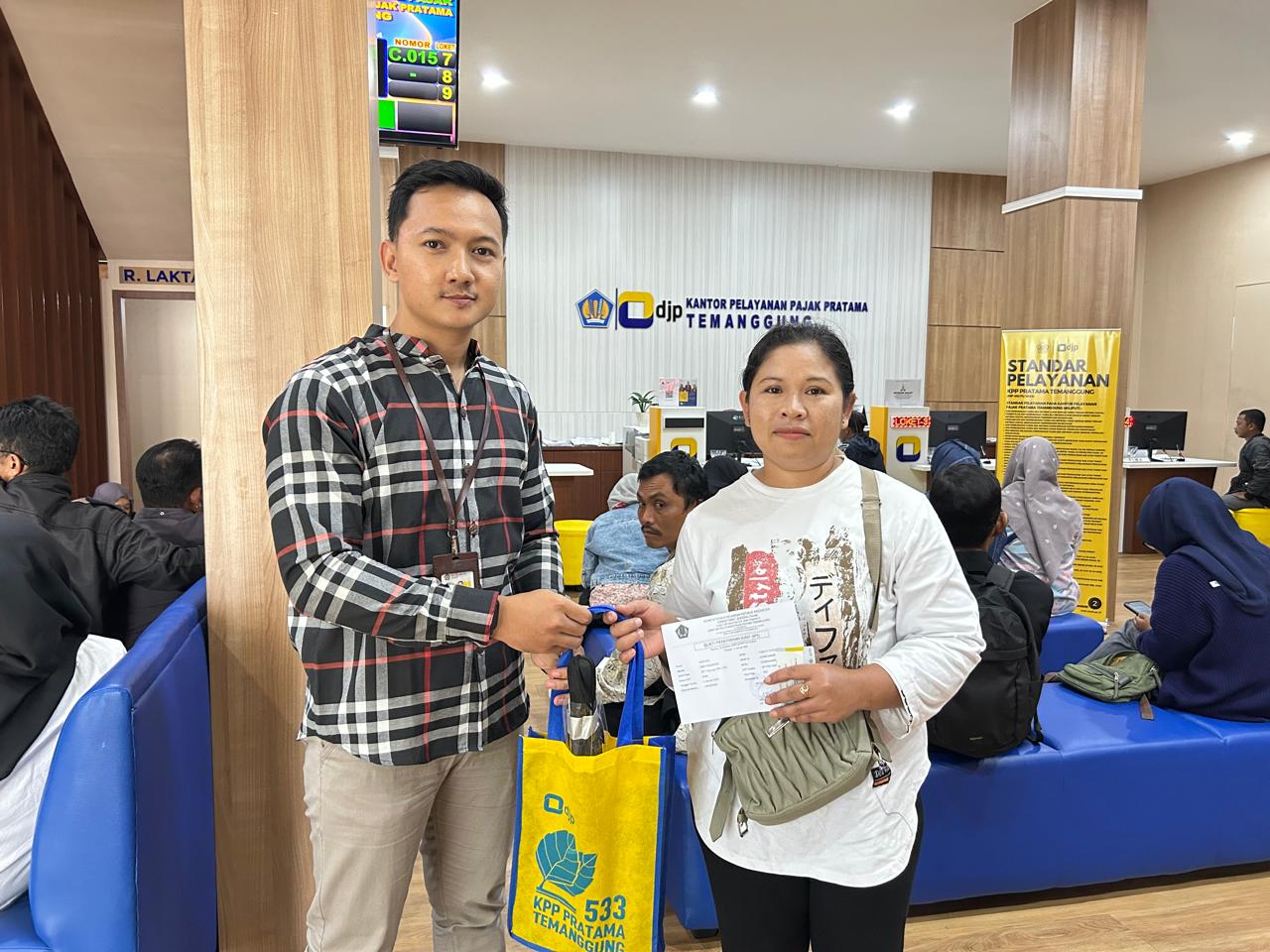 Kantor Pelayanan Pajak (KPP) Pratama Temanggung memberikan apresiasi kepada 5 (lima) wajib pajak yang melaporkan Surat Pemberitahuan (SPT) Tahunan 2024 paling awal pada hari pertama di bulan Januari tahun 2025 (Kamis, 2/1). Kepala Seksi Pelayanan, Rina Setyawati Lestari memberikan secara langsung souvenir kepada wajib pajak yang datang dan lapor SPT Tahunan di loket Tempat Pelayanan Terpadu (TPT) KPP Pratama Temanggung. Pemberian souvenir merupakan salah satu bentuk apresiasi kepada wajib pajak atas kesadarannya dalam melaporkan SPT Tahunan lebih awal daripada wajib pajak lainnya.