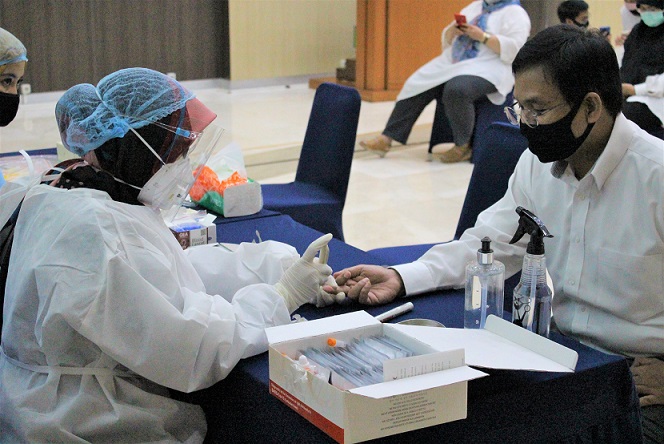 Kanwil DJP Wajib Pajak Besar (WP Besar) mengadakan pemeriksaan kesehatan pegawai dengan metode rapid test di Aula Sinergi 1 lantai 2 gedung Dr. K.R.T Radjiman Wedyodiningrat (Selasa, 07/07). Kegiatan yang dibagi menjadi dua sesi sejak Senin, 7 Juli 2020 ini diadakan sebagai bentuk komitmen Kanwil DJP Wajib Pajak Besar dalam memberikan pelayanan yang optimal kepada wajib pajak sesuai standar protokol kesehatan kenormalan baru.