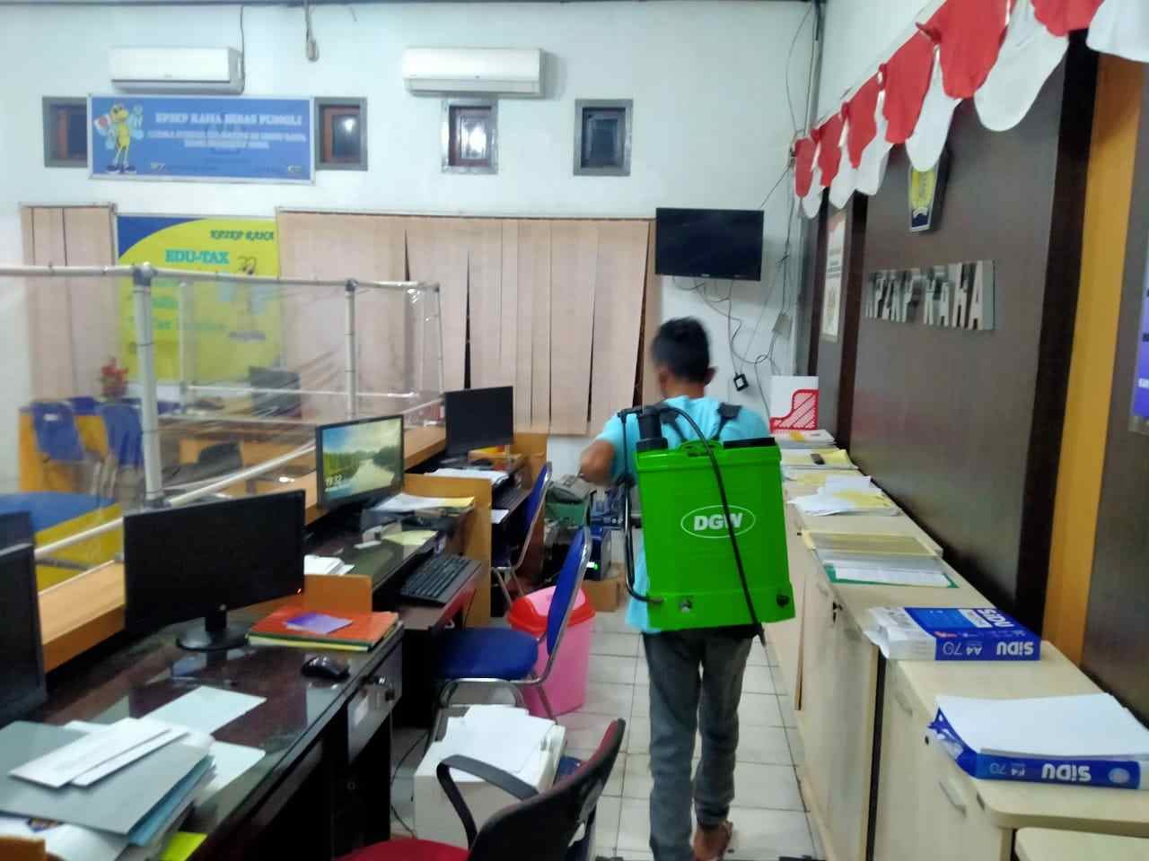 Kantor Pelayanan, Penyuluhan, dan Konsultasi Perpajakan (KP2KP) Raha melaksanakan penyemprotan cairan disinfektan pada seluruh area KP2KP Raha, Kabupaten Muna (Minggu, 29/8).