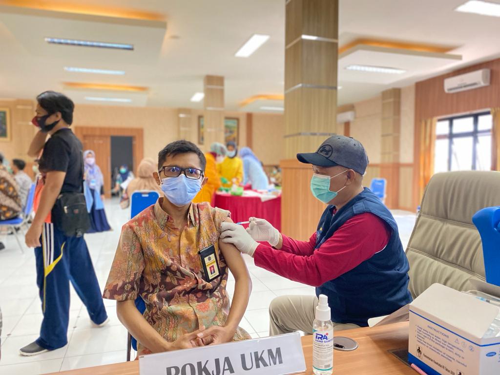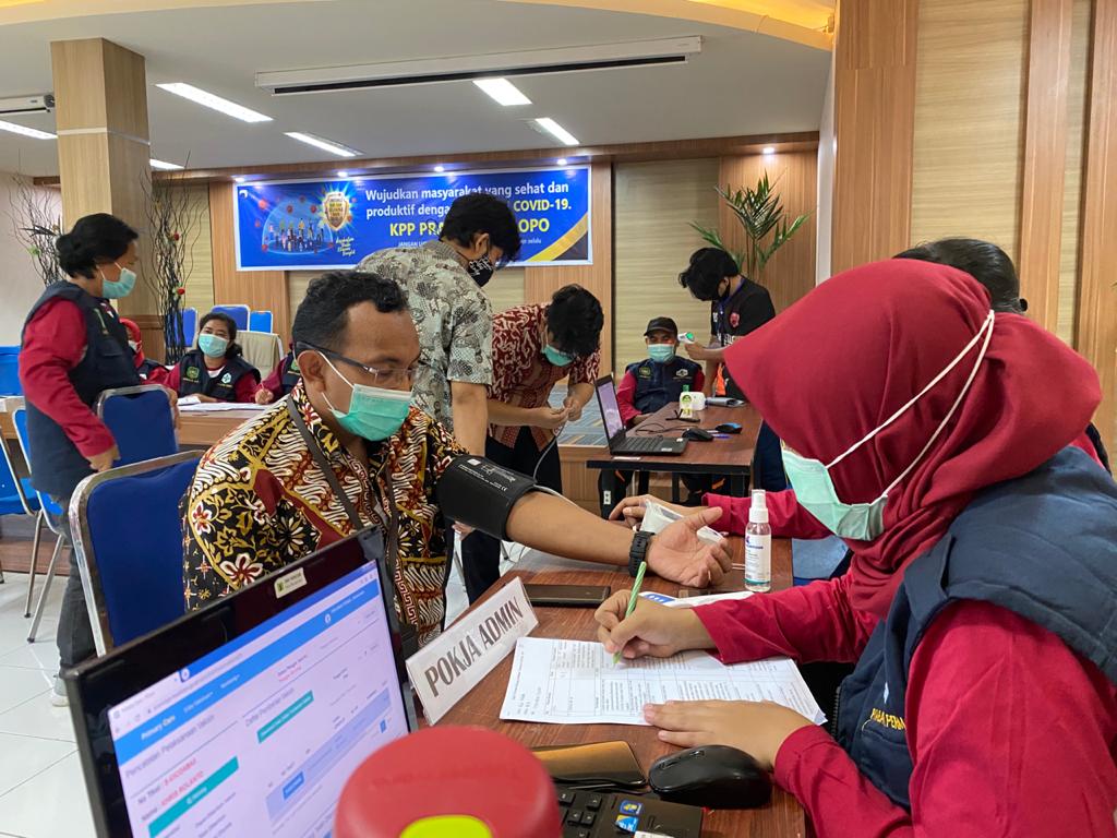 Sebelum vaksinasi dilakukan, seluruh pegawai melaksanakan tes usap antigen dan skrining kesehatan terlebih dahulu. Skrining kesehatan tersebut antara lain pengecekan suhu tubuh, tekanan darah serta pemeriksaan riwayat kesehatan melalui wawancara (anamnesa). Pegawai yang hasil tes usap antigennya negatif serta memenuhi standar skrining kesehatan kemudian diberikan vaksin.