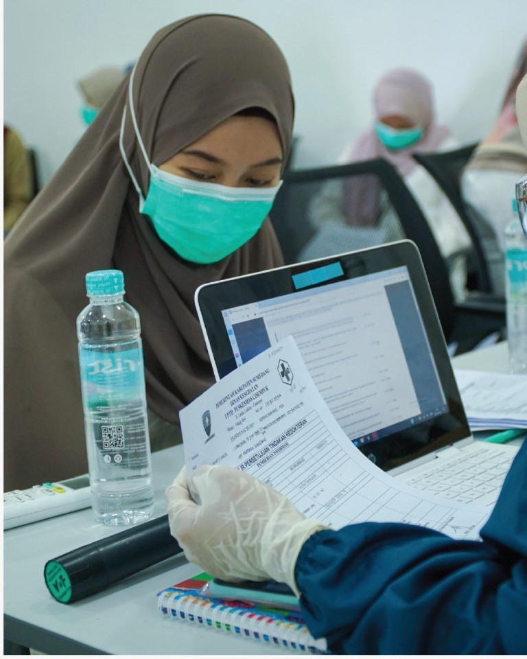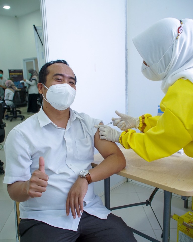 Tahap selanjutnya penyuntikan vaksin, para pegawai yang telah dinyatakan boleh mendapat vaksin oleh petugas screening kemudian dilakukan penyuntikan vaksin. Dan tahap terakhir pencatatan, para pegawai yang telah mendapat vaksin menunggu 30 menit sebagai antisipasi bila ada KIPI (Kejadian Ikutan Pasca Imunisasi) dan para pegawai penerima vaksin mendapat kartu vaksinasi Covid-19.