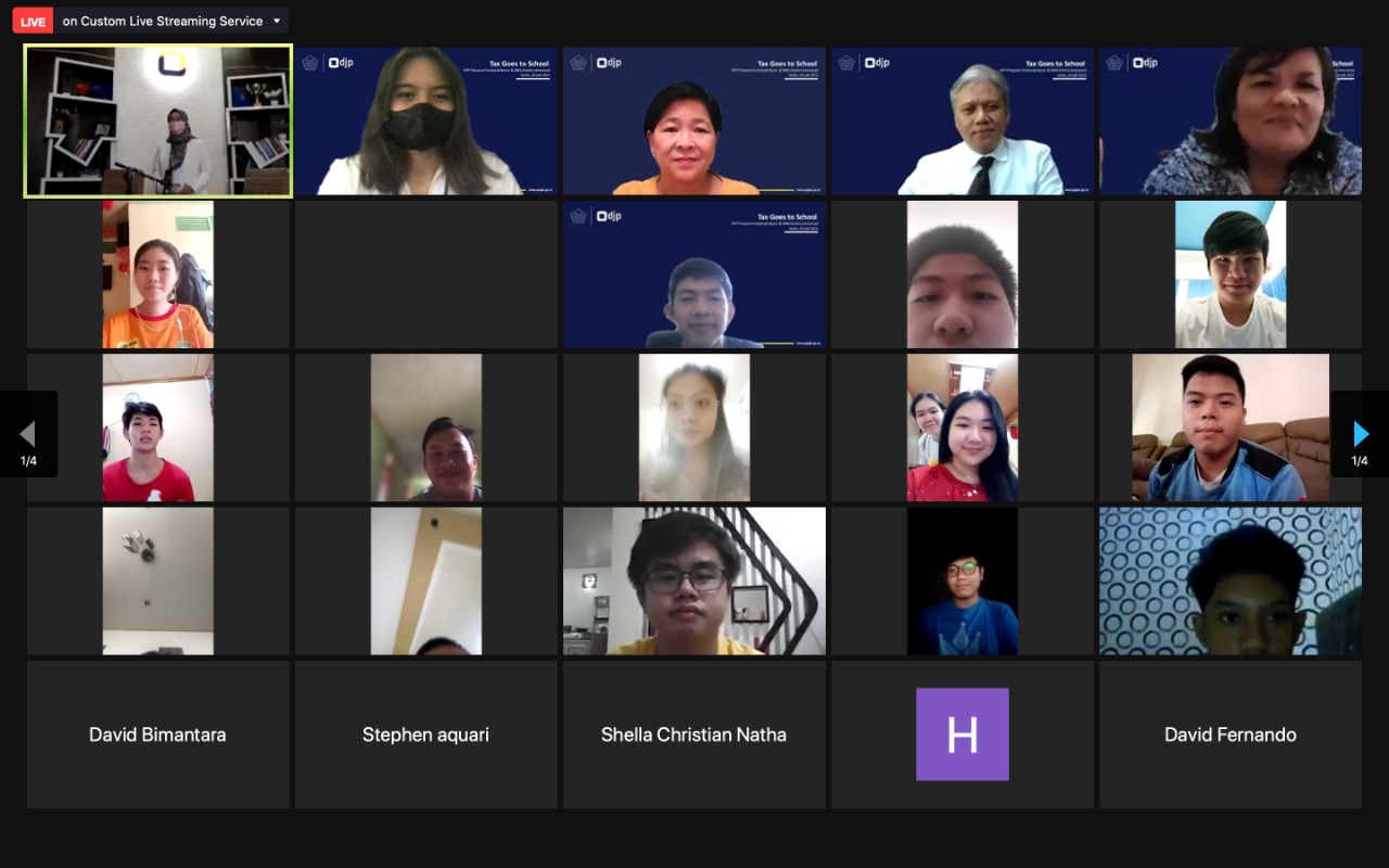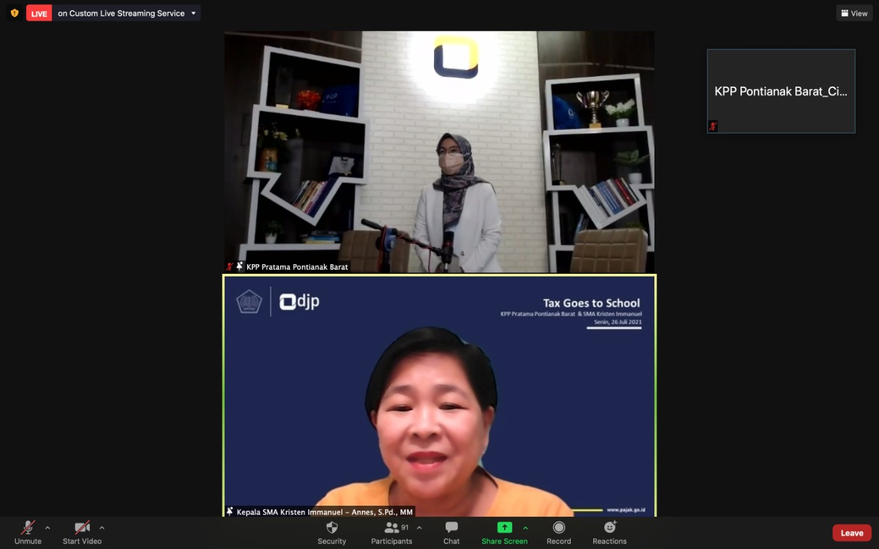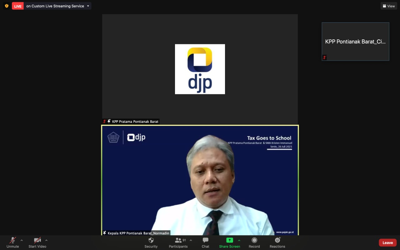 Kantor Pelayanan Pajak (KPP) Pratama Pontianak Barat mengadakan acara Tax Goes To School (TGTS) dengan tema “Pelajar Paham Pajak” melalui aplikasi Zoom Cloud Meetings dan YouTube Live di aula KPP Pratama Pontianak Barat, Kota Pontianak (Senin, 26/7). Acara yang diikuti oleh 87 siswa dan didampingi oleh 4 guru dari SMA Kristen Immanuel Pontianak ini dimulai pada pukul 09.00 sampai dengan 11.00 WIB.