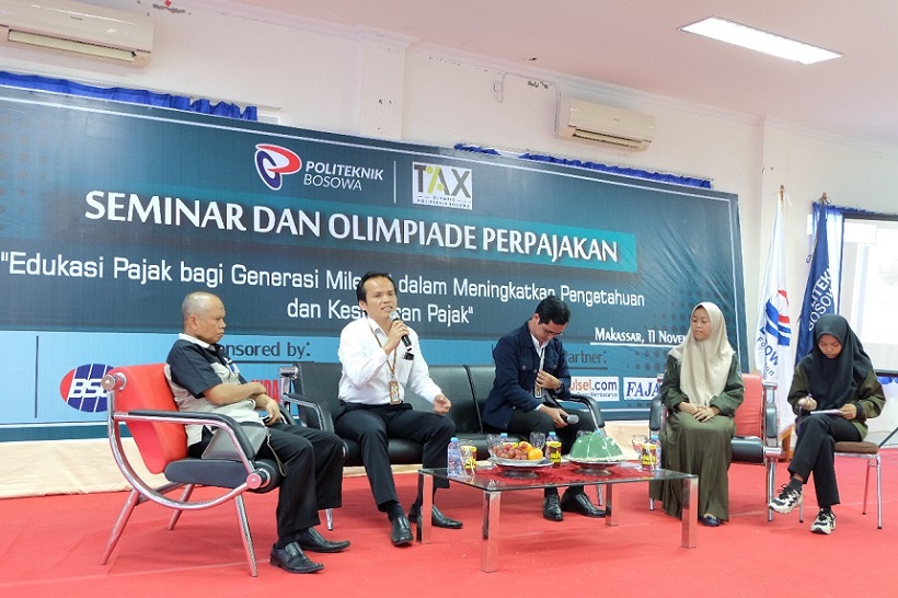 Kanwil DJP Sulawesi Selatan, Barat, dan Tenggara (Sulselbartra) berkerja sama dengan Politeknik Bosowa Makassar mengadakan kegiatan Seminar Perpajakan dan Olimpiade Pajak yang dilangsungkan di Aula Politeknik Bosowa, Makassar (Senin, 11/11). Acara ini diikuti oleh perwakilan pelajar dari SMA/SMK di lingkungan Kota Makassar dan sekitarnya sebagai peserta.