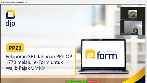 KPP Pratama Lubuk Linggau dan KP2KP Tugumulyo mengadakan Kelas Pajak online melalui webinar bagi Wajib Pajak UMKM. Kelas pajak secara daring ini diadakan dalam dua sesi, sesi pagi pukul 10.00-11.00 WIB dan sesi sore pukul 14.00-15.00 WIB dengan topik Tutorial Pelaporan SPT Tahunan PPh Orang Pribadi 1770 melalui e-Form bagi Wajib Pajak UMKM menggunakan aplikasi Zoom (Rabu, 29/4). Pemateri diisi oleh Account Reprensentative KPP Pratama Lubuk Linggau Mohamad Fauzan dan M. Haris Arifiansyah.