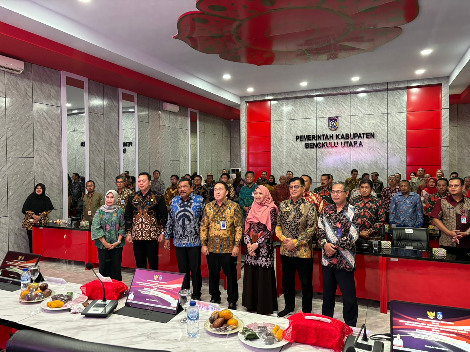 Kepala Kantor Wilayah Direktorat Jenderal Perbendaharaan (DJPb) Provinsi Bengkulu Bayu Andi Prasetya selaku Kepala Kantor Perwakilan Kemenkeu Satu Provinsi Bengkulu beserta seluruh kepala kantor satuan kerja Kementerian Keuangan di Kota Bengkulu menghadiri undangan kegiatan penandatanganan nota kesepakatan atau Memorandum of Understanding (MoU) pengelolaan keuangan negara dengan Pemerintah Daerah Kabupaten Bengkulu Utara di Ruang Pola Kantor Bupati Bengkulu Utara (Kamis, 22/2).