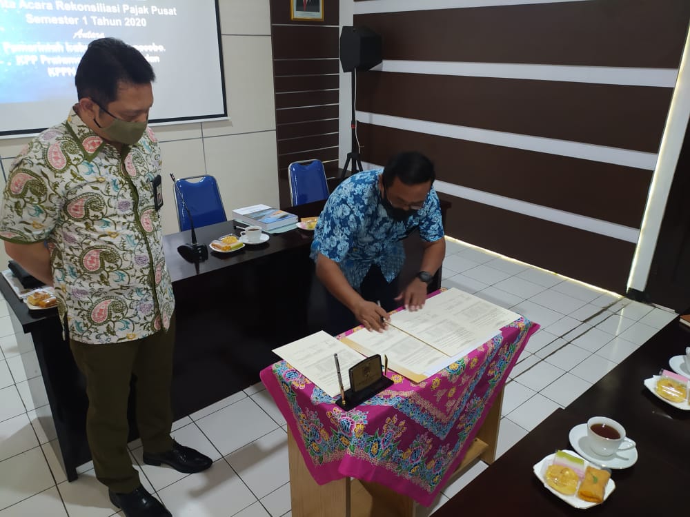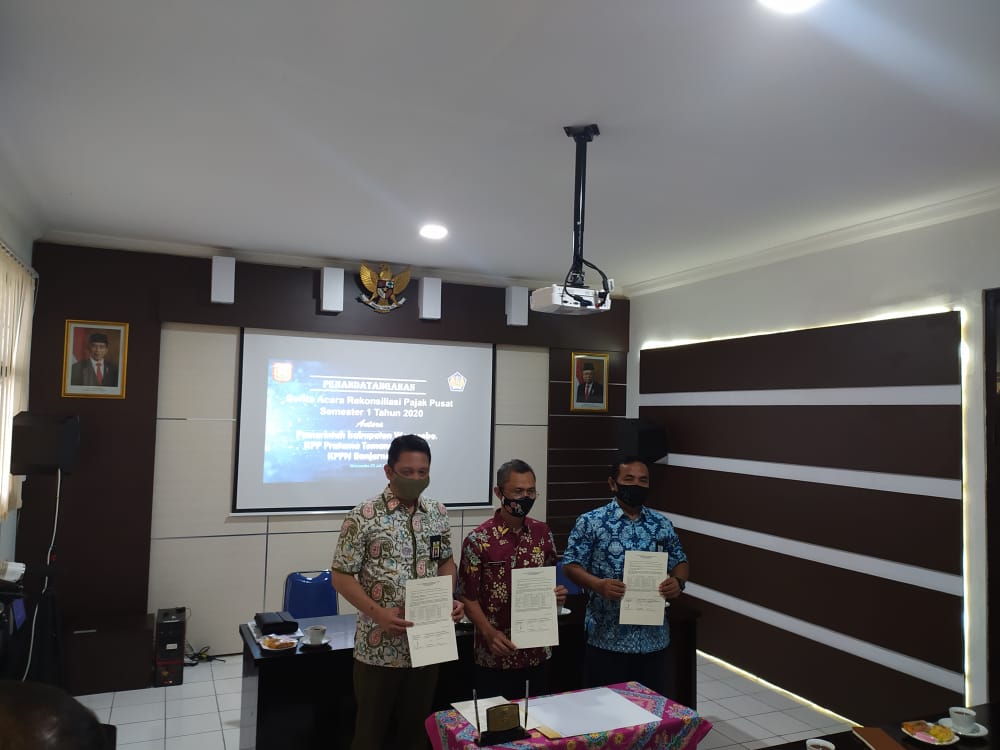 Kepala KPP Pratama Temanggung bersama dengan Pemerintah Daerah (Pemda) Kabupaten Wonosobo dan KPPN Banjarnegara melakukan penandatanganan rekonsiliasi penyetoran pajak pusat semester I tahun 2020 di ruang rapat BPKAD Kabupaten Wonosobo (Kamis, 23/7).