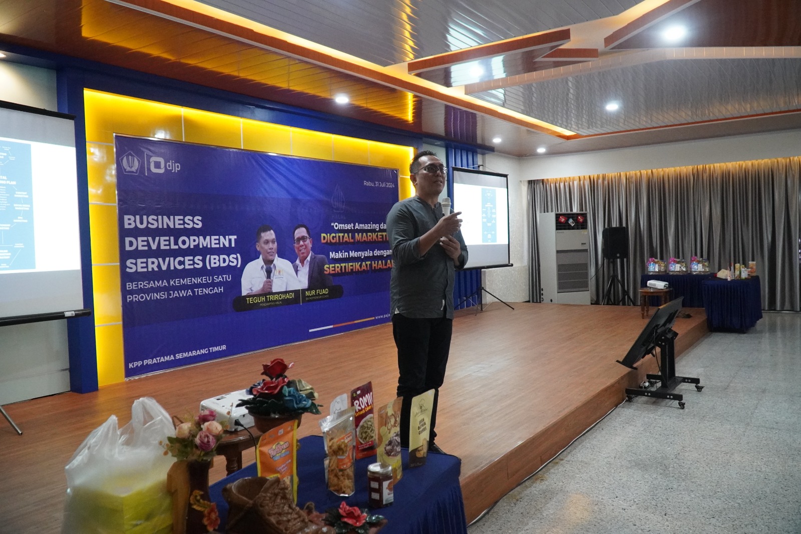 “Sekarang semua serba digital pakai tiktok segala macam, acara ini kita harapkan bisa meningkatkan kegiatan usaha” ungkap Pestamen Situmorang Kepala KPP Pratama Semarang Timur saat membuka kegiatan Business Development Services (BDS) dengan tema “Omset Amazing dari Digital Marketing, Makin Menyala dengan Sertifikat Halal” bertempat di aula lantai 4 KPP Pratama Semarang Timur, Semarang. (Rabu, 31/7).
