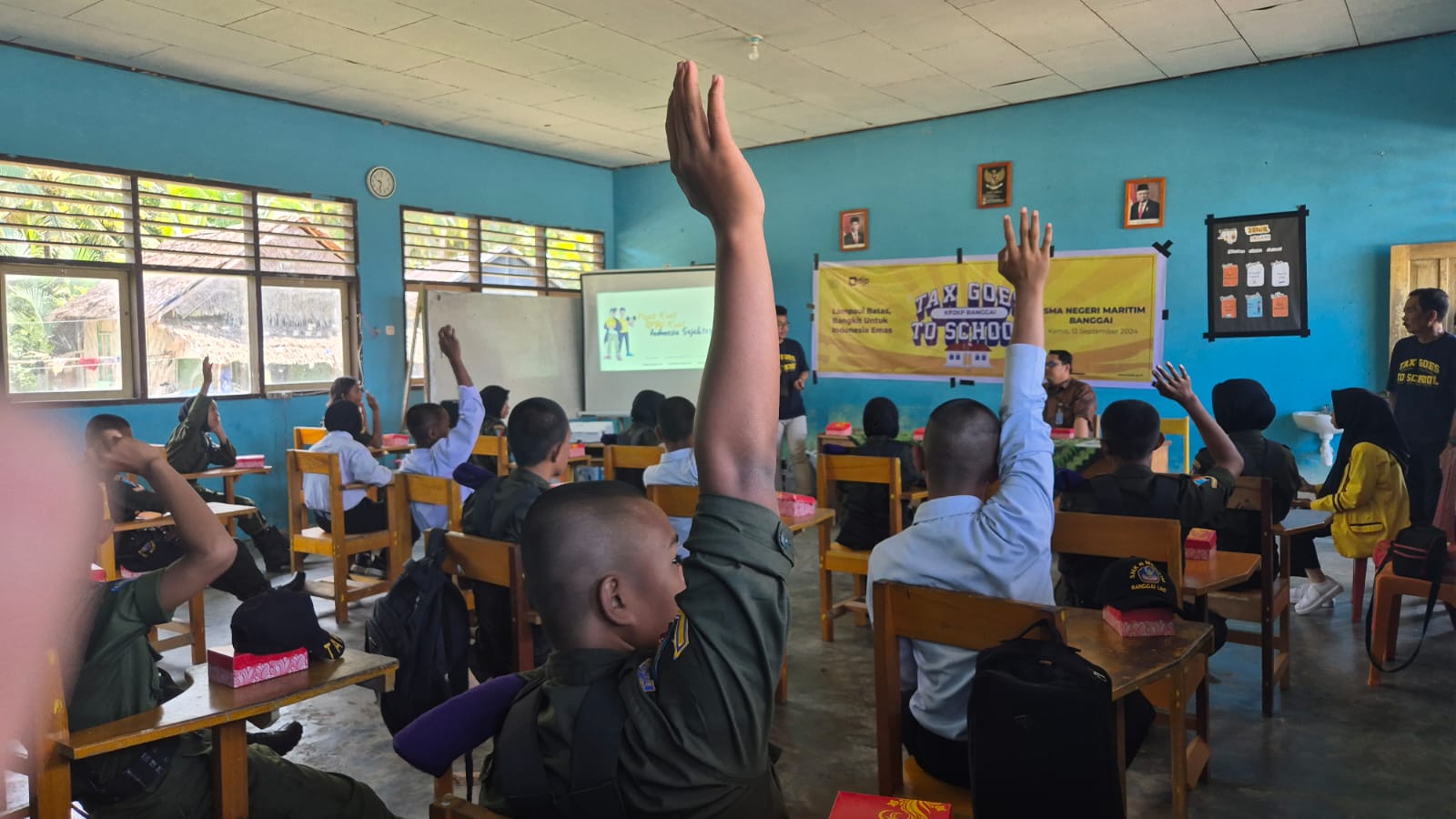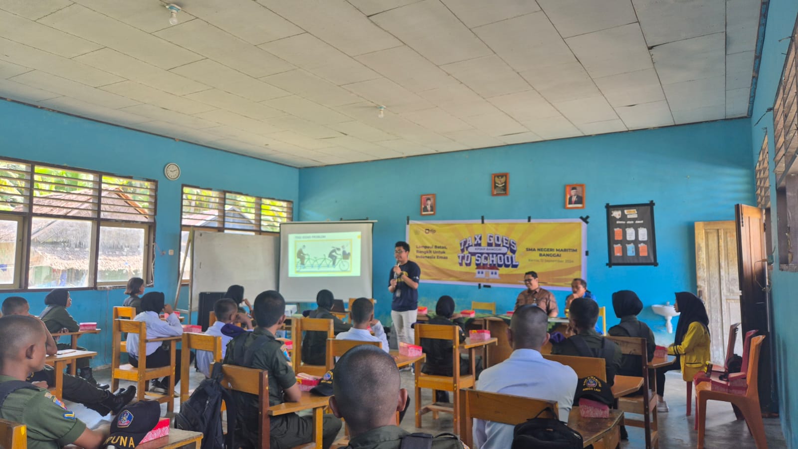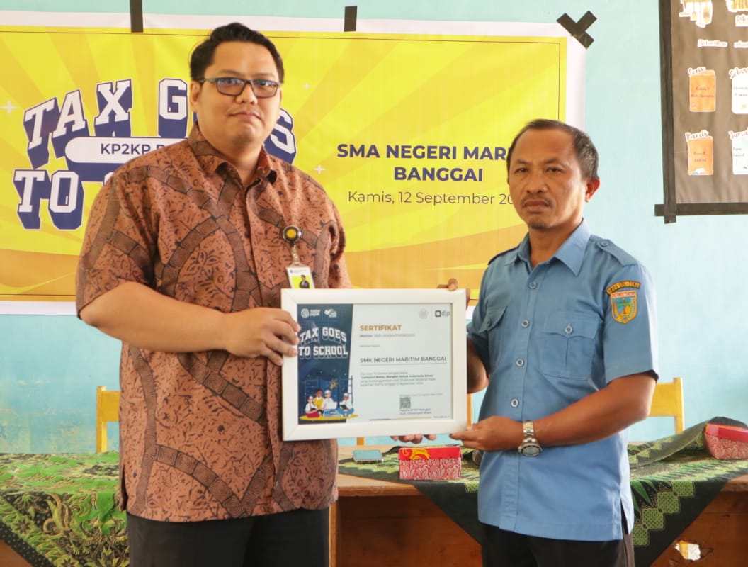 Kantor Pelayanan, Penyuluhan, dan Konsultasi Perpajakan (KP2KP) Banggai menggelar kegiatan Tax Goes to School (TGTS) di SMK Negeri Maritim Banggai, Sulawesi Tengah (Kamis, 12/9). Kegiatan digelar di Ruang Kelas SMK Negeri Maritim Banggai dengan diikuti dua puluh empat siswa-siswi dari kelas 10 dan kelas 12.