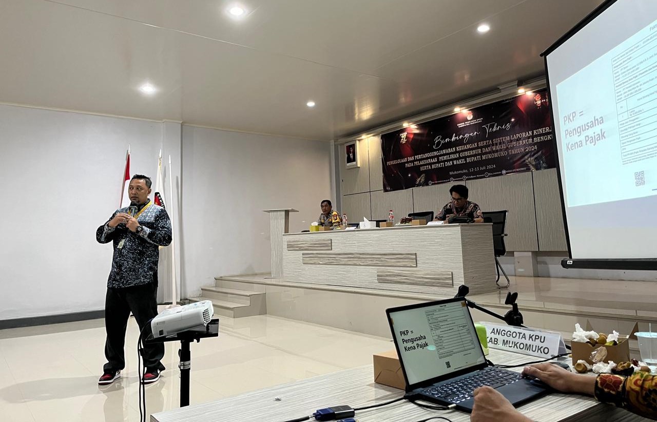 Kantor Pelayanan, Penyuluhan, dan Konsultasi Perpajakan (KP2KP) Mukomuko memenuhi undangan Komisi Pemilihan Umum (KPU) Kabupaten Mukomuko sebagai narasumber dalam kegiatan Bimbingan Teknis Pengelolaan dan Pertanggungjawaban Keuangan serta Sistem Laporan Kinerja pada Pemilihan Gubernur dan Wakil Gubernur Bengkulu serta Bupati dan Wakil Bupati Mukomuko Tahun 2024 (Jumat, 12/7).